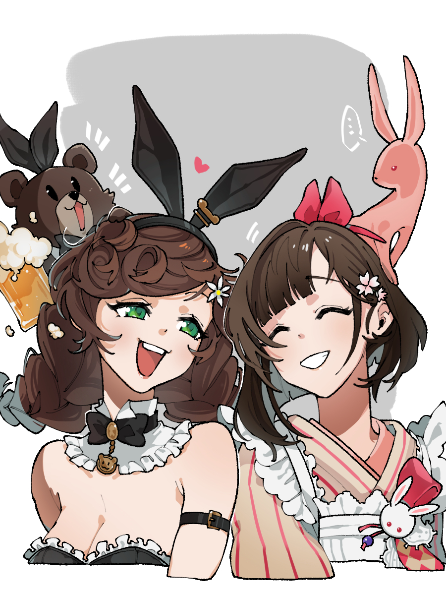 ... 2girls :d animal animal_ears animal_on_head apron arm_belt bare_shoulders bear beer_mug black_bow black_bowtie black_leotard bow bowtie braid breasts brown_hair bunny_bunny_(reverse:1999) cleavage collar cropped_torso cup detached_collar fake_animal_ears flower frilled_apron frilled_collar frills frog_hair_ornament green_eyes grey_background grin hair_bow hair_ornament highres holding holding_cup japanese_clothes kaeru_(uj26cobrsv) kimono leotard long_hair looking_at_another looking_to_the_side low_twin_braids maid medium_breasts mug multiple_girls notice_lines on_head open_mouth pink_flower playboy_bunny rabbit rabbit_ears rabbit_ornament red_bow reverse:1999 satsuki_(reverse:1999) short_hair smile spoken_ellipsis strapless strapless_leotard striped_clothes striped_kimono teeth traditional_bowtie twin_braids two-tone_background upper_body upper_teeth_only vertical-striped_clothes vertical-striped_kimono wa_maid white_apron white_background white_flower yellow_kimono