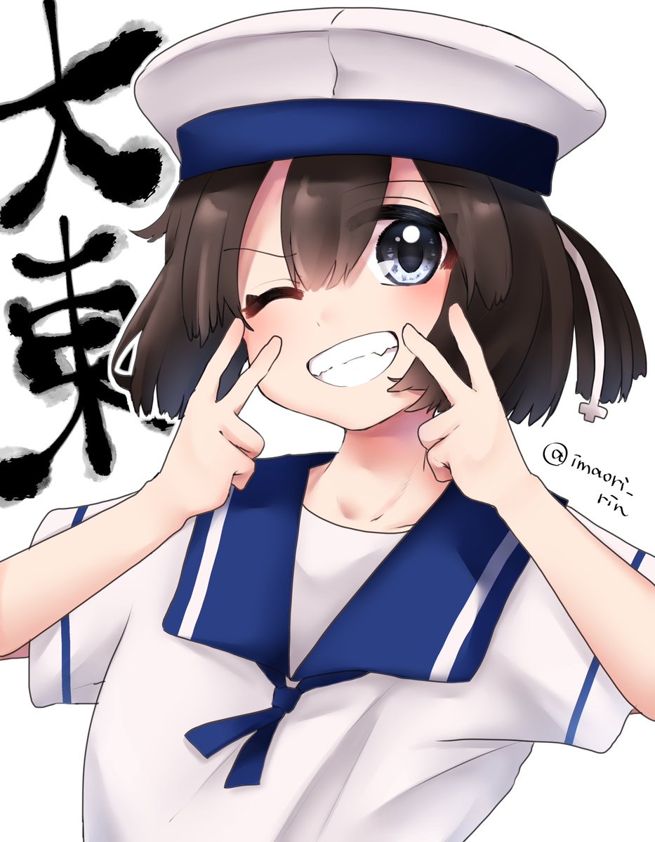 1girl black_hair blue_eyes blue_sailor_collar bob_cut character_name daitou_(kancolle) dress hat high_ponytail imaori_rin kantai_collection looking_at_viewer one-hour_drawing_challenge one_eye_closed ponytail sailor_collar sailor_dress sailor_hat short_hair short_ponytail short_sleeves solo upper_body white_dress white_hat