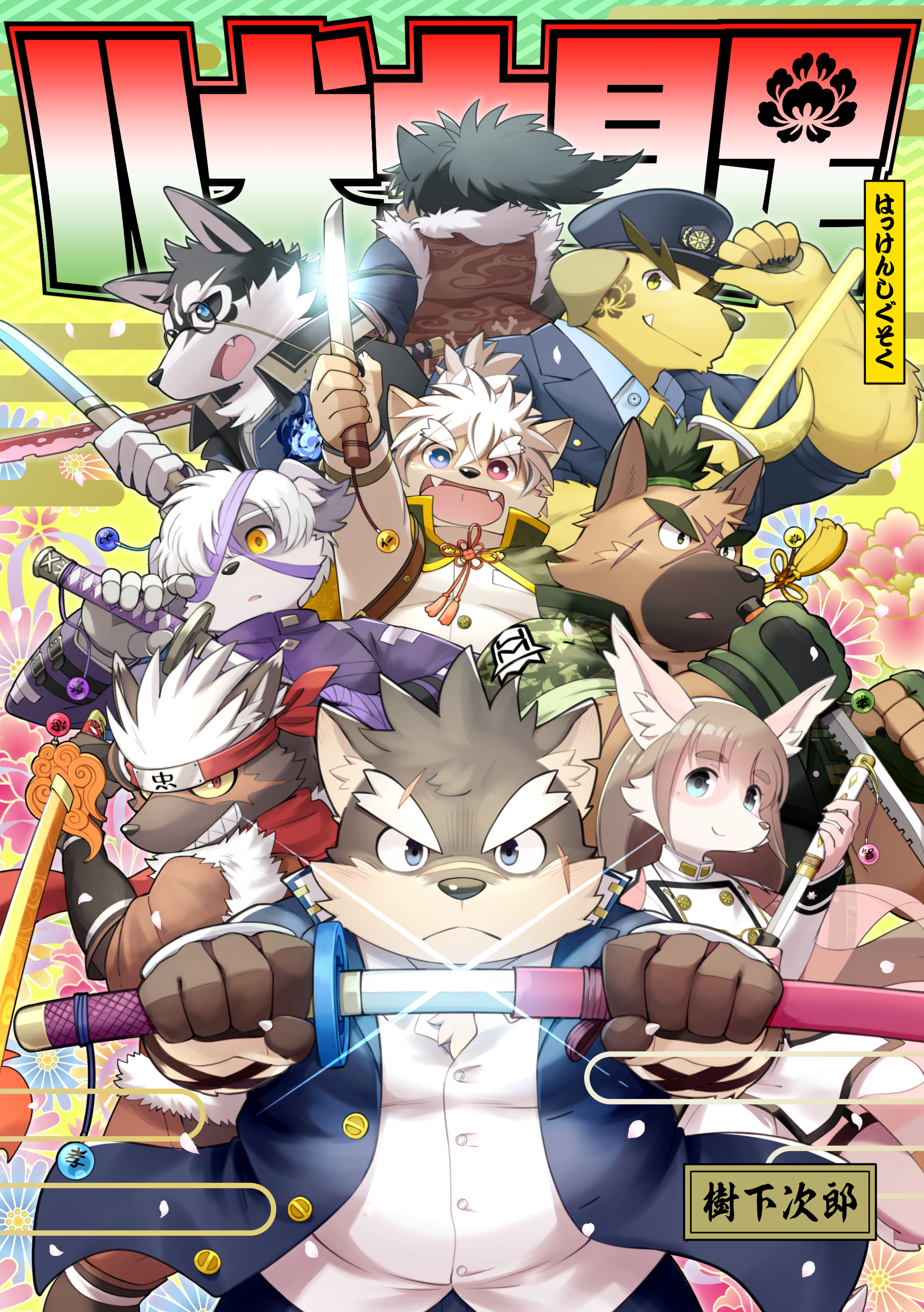 6+boys absurdres animal_ears from_behind bandage_over_one_eye bara camouflage dog_boy dog_ears egasumi fang floral_background floral_print forked_eyebrows fur-trimmed_jacket fur_trim furry furry_male glint heterochromia highres holding holding_sword holding_weapon jacket kinoshita_jiroh looking_at_viewer looking_to_the_side male_focus masanori_(housamo) masashi_(housamo) moritaka_(housamo) multiple_boys nobumichi_(housamo) peony_print police police_uniform sheath shino_(housamo) shirt sword tadatomo_(housamo) tanetomo_(housamo) thick_eyebrows tokyo_houkago_summoners translation_request unsheathing weapon white_shirt yasuyori_(housamo) yoshito_(housamo)