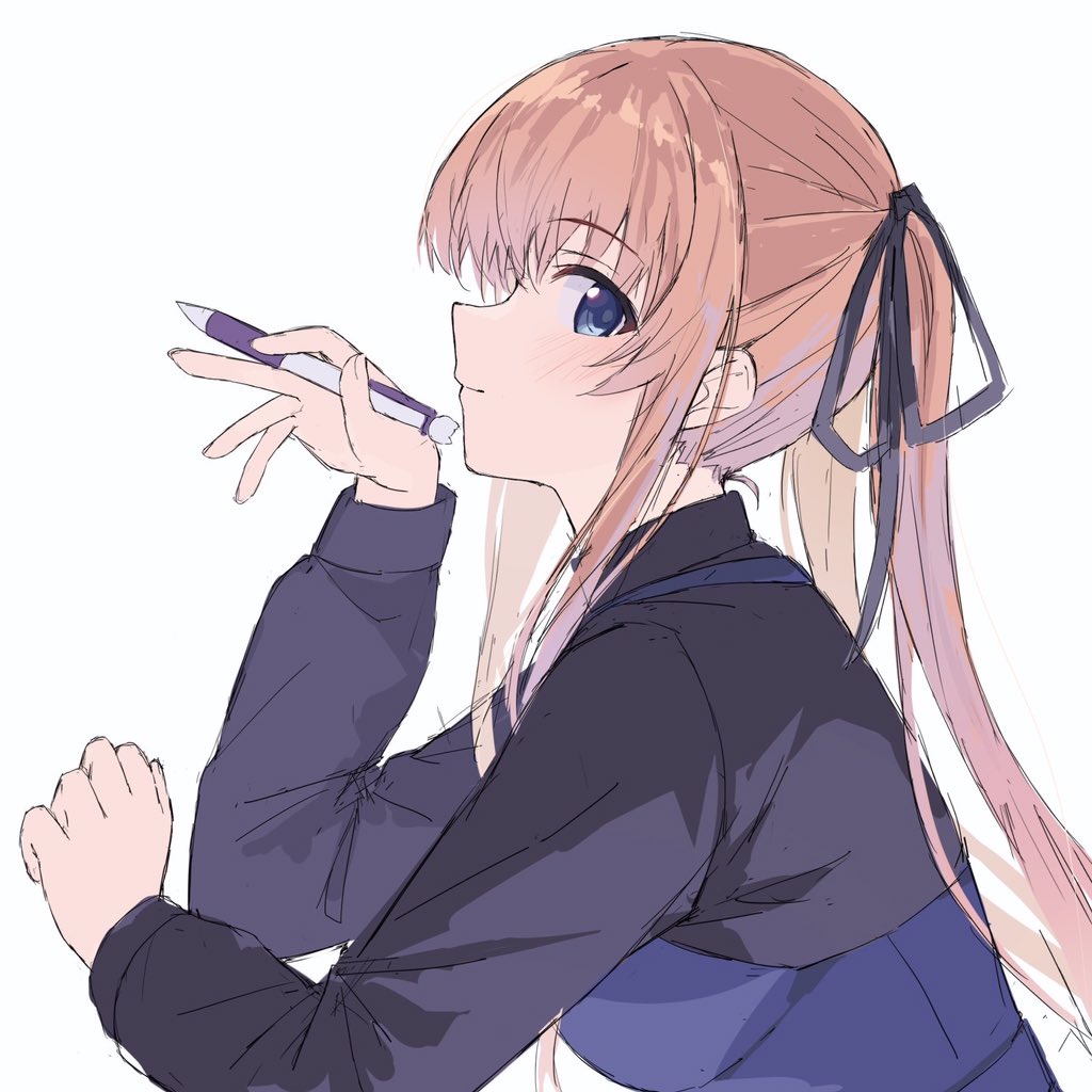 1girl black_ribbon blonde_hair blue_eyes blue_shirt blush closed_mouth commentary from_side hair_ribbon hand_up holding holding_pen long_hair long_sleeves looking_at_viewer pen profile ribbon saenai_heroine_no_sodatekata sawamura_spencer_eriri shirt sidelocks sideways_glance simple_background smile solo straight_hair tsurime twintails very_long_hair white_background yanagi_marie