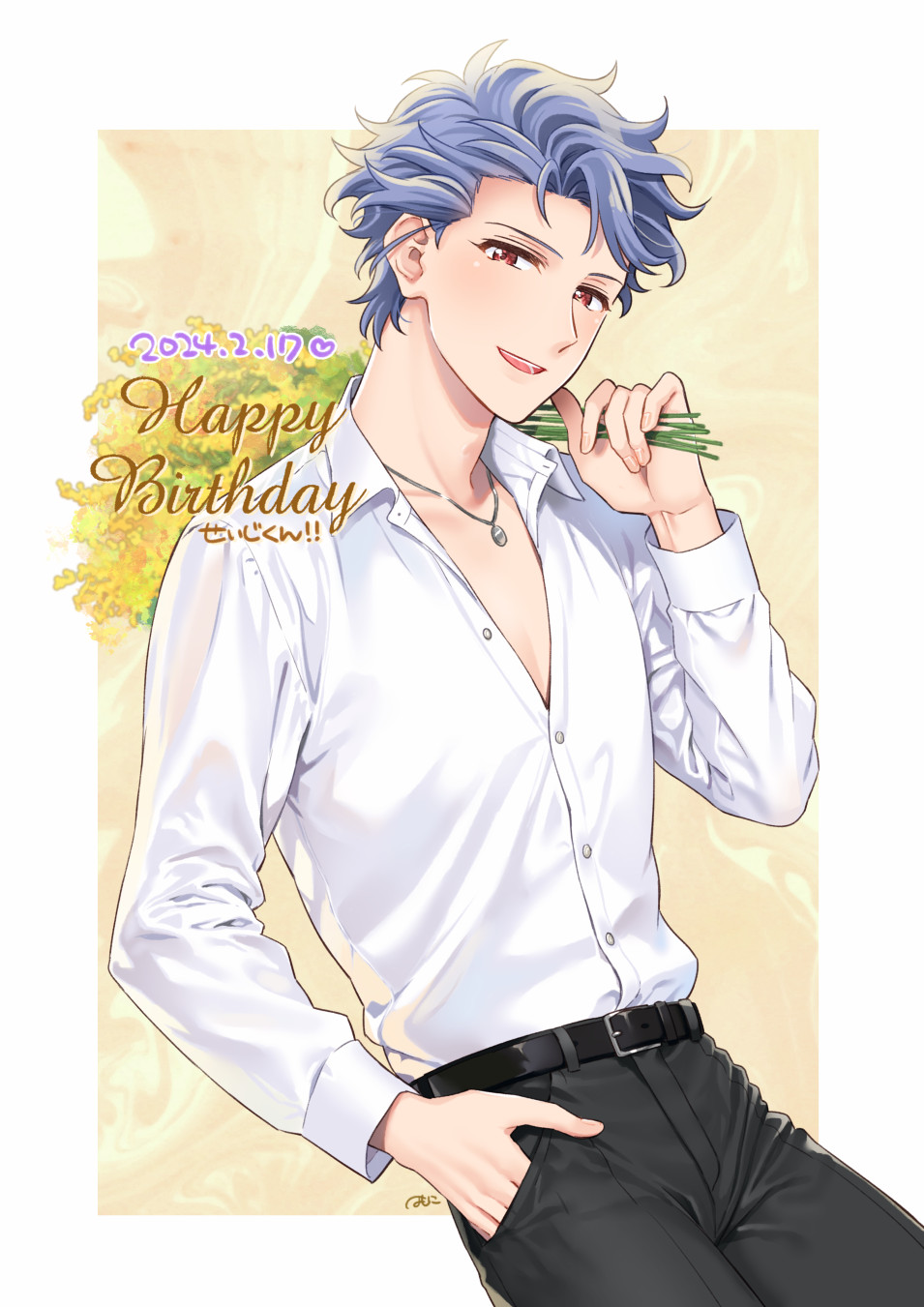 1boy belt belt_buckle black_belt black_pants bouquet buckle character_name collared_shirt cowboy_shot dated flower grey_hair hand_in_pocket happy_birthday highres holding holding_bouquet jewelry krudears long_sleeves looking_at_viewer male_focus necklace open_mouth pants red_eyes shirt shitara_seiji short_hair smile solo tokimeki_memorial tokimeki_memorial_girl's_side tokimeki_memorial_girl's_side_3rd_story wavy_hair white_shirt yellow_flower
