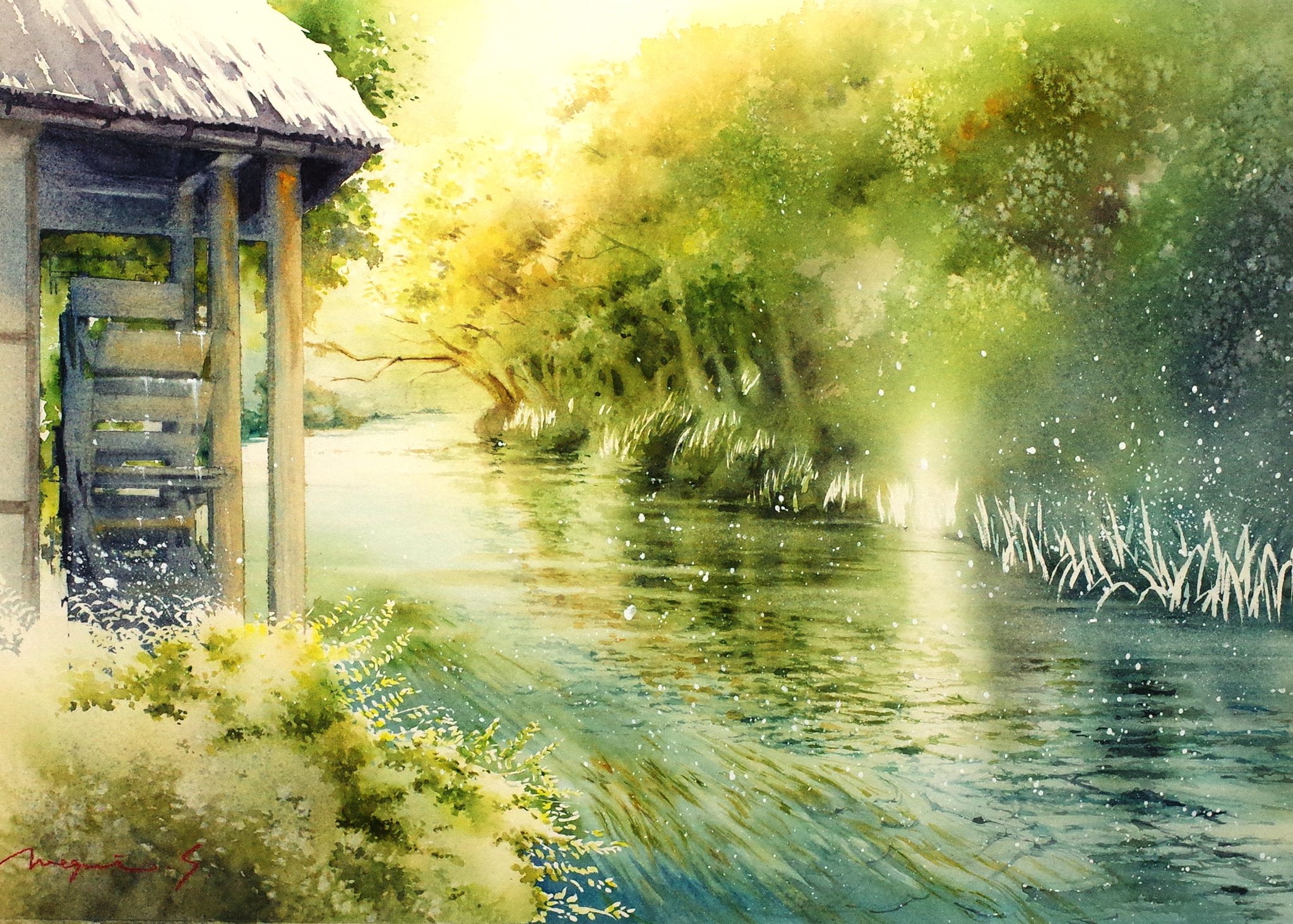 dappled_sunlight day forest highres nature original painting_(medium) scenery shimizu_megumi_(m_acquerello) sunlight traditional_media tree water watercolor_(medium)