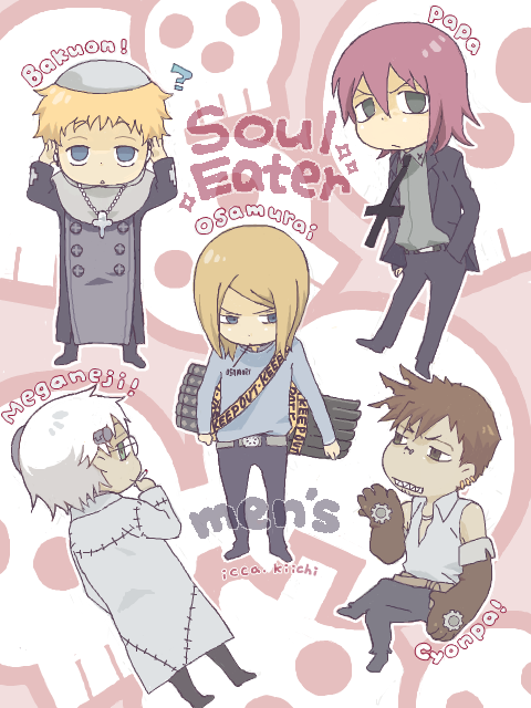 5boys blonde_hair blue_eyes brown_hair deformed english_text franken_stein_(soul_eater) full_body giriko_(soul_eater) glasses justin_law mifune_(soul_eater) multiple_boys n_z_m object_through_head red_hair screw_in_head short_hair soul_eater spirit_albarn standing white_hair