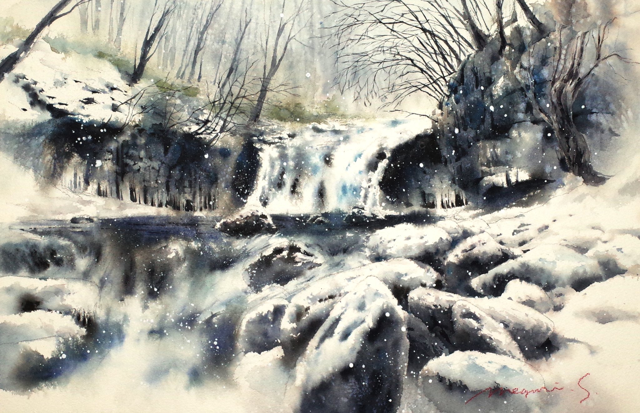 bare_tree bush cloud cloudy_sky dead_plants fog forest highres nature no_humans original painting_(medium) rock scenery shimizu_megumi_(m_acquerello) sky snow snowing sunlight traditional_media tree water watercolor_(medium) waterfall