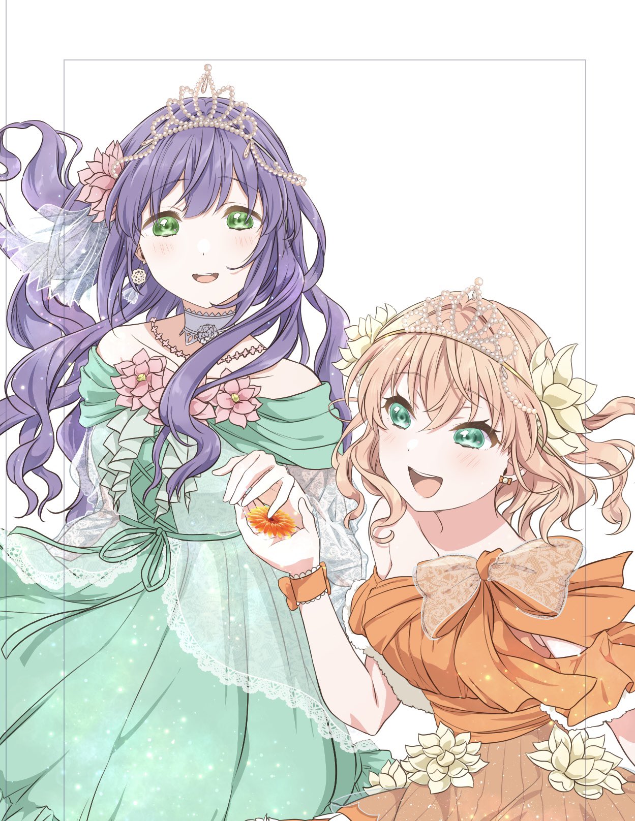 2girls :d aqua_eyes bow bow_earrings breasts choker collarbone commentary cross-laced_clothes cross-laced_dress crossed_bangs dress dress_bow dress_flower earrings flower green_dress green_eyes hair_down hair_flower hair_ornament highres hinoshita_kaho hinoshita_kaho_(kiseki_no_butoukai_(103rd)) hiro_(fluffy_palette) holding holding_flower imminent_hand_holding jewelry kiseki_no_budoukai_(102nd)_(love_live!) kiseki_no_budoukai_(103rd)_(love_live!) layered_dress link!_like!_love_live! long_hair looking_at_another lotus love_live! medium_breasts medium_hair multiple_girls off-shoulder_dress off_shoulder official_alternate_costume official_alternate_hairstyle open_mouth orange_bow orange_dress orange_flower orange_hair otomune_kozue otomune_kozue_(kiseki_no_butoukai_(102nd)) pink_flower princess purple_hair see-through_dress_layer short_sleeves simple_background smile stud_earrings teeth tiara unfinished upper_teeth_only virtual_youtuber white_background white_choker white_tiara yellow_flower