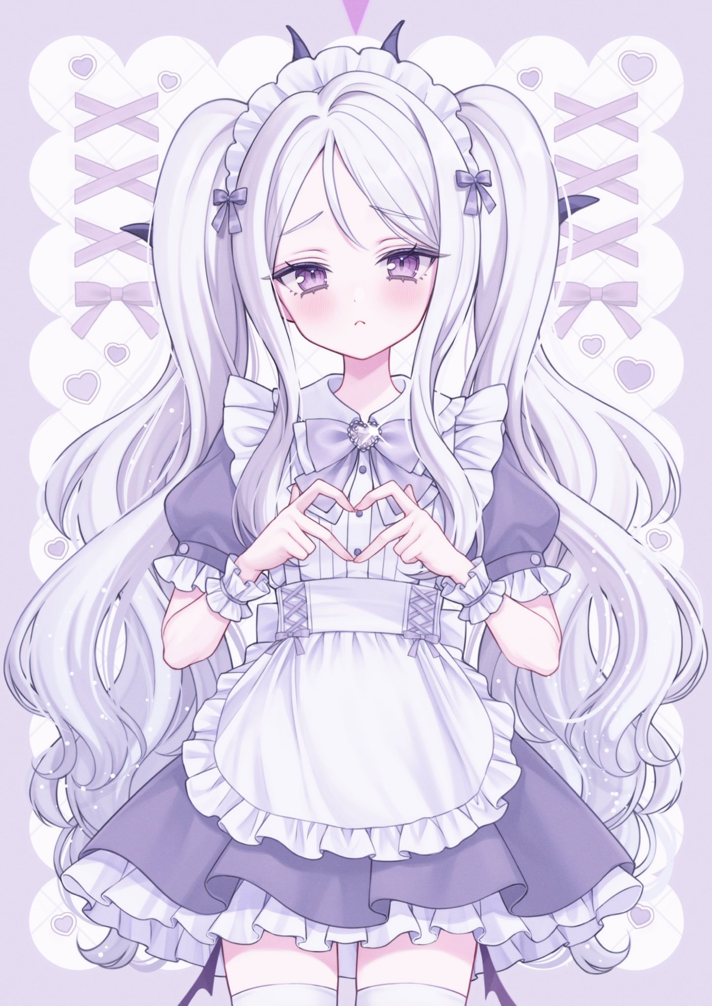 1girl alternate_costume alternate_hairstyle apron blue_archive closed_mouth dress enmaided hair_ribbon hairband halo heart heart_hands highres hina_(blue_archive) horns long_hair looking_at_viewer maid maid_apron maid_headdress purple_eyes ribbon shy solo thighhighs thighs twintails uxx2ixu white_hair wings