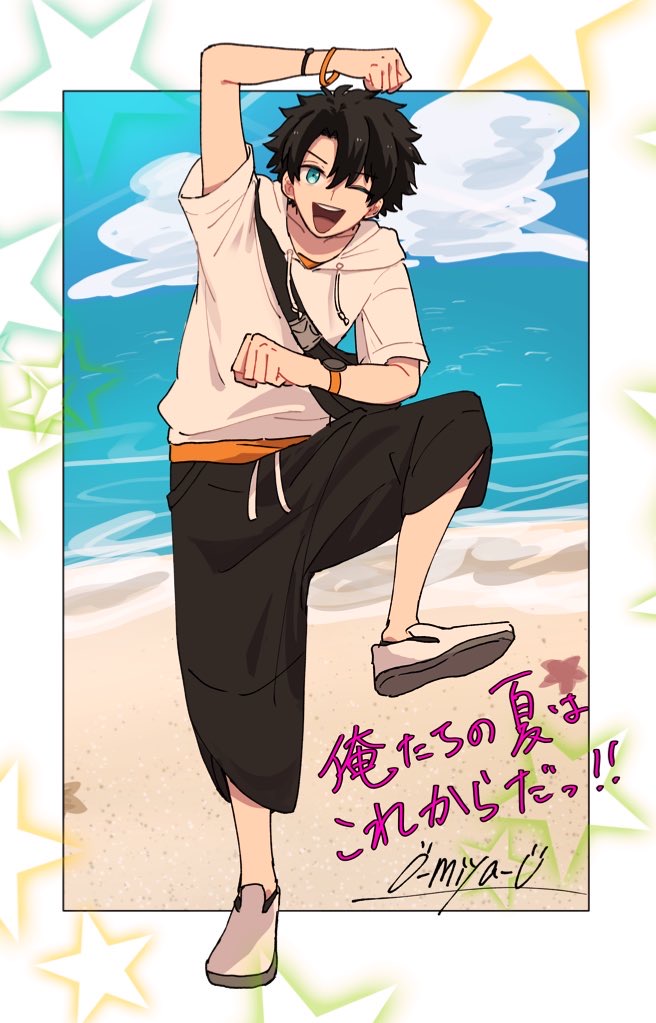 1boy ;d black_hair black_pants blue_eyes fanny_pack fate/grand_order fate_(series) fujimaru_ritsuka_(male) fujimaru_ritsuka_(male)_(summer_street) hood hooded_shirt hoodie jacket jujutsu_kaisen lost_in_paradise o-miya_(ohmiya_you) one_eye_closed open_mouth pants parody shirt short_hair short_sleeves smile white_hoodie