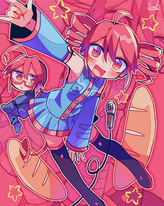 1boy 1girl \m/ ahoge arm_up baguette bare_shoulders black_footwear black_pants black_shirt boots bread brother_and_sister buttons chibi collared_shirt crossed_legs detached_sleeves drill_hair fang food foot_out_of_frame full_body grey_shirt grey_skirt grey_sleeves hair_between_eyes halftone halftone_background kasane_ted kasane_teto kasane_teto_(utau) long_hair long_sleeves looking_at_another looking_at_viewer low_ponytail medium_hair microphone miniskirt nail_polish open_mouth outline pants ponytail red-framed_eyewear red_background red_eyes red_hair red_nails red_trim semi-rimless_eyewear shirt siblings sitting skin_fang skirt sleeveless sleeveless_shirt smile solo_focus star_(symbol) thigh_boots thighhighs twin_drills utau white_outline yuusuke-kun zettai_ryouiki zoom_layer