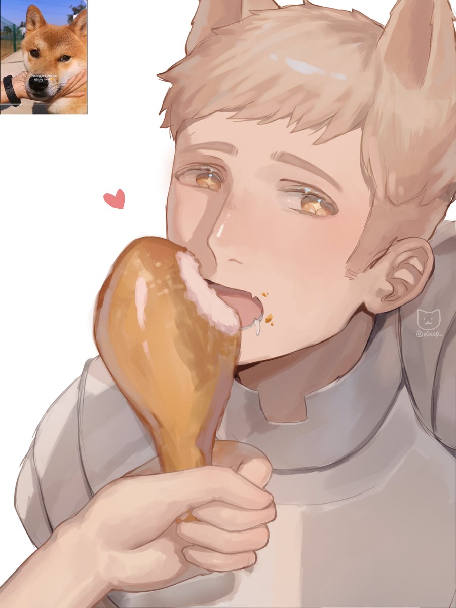 +_+ 1boy animal animal_ears armor artist_name brown_eyes brown_hair chicken_(food) colored_eyelashes commentary disembodied_hand dog dog_boy dog_ears drooling dungeon_meshi eating eikop english_commentary fang food food_on_face heart highres holding holding_food kemonomimi_mode logo looking_at_viewer male_focus open_mouth pauldrons pov reference_inset short_hair shoulder_armor simple_background skin_fang twitter_username undercut upper_body very_short_hair white_background