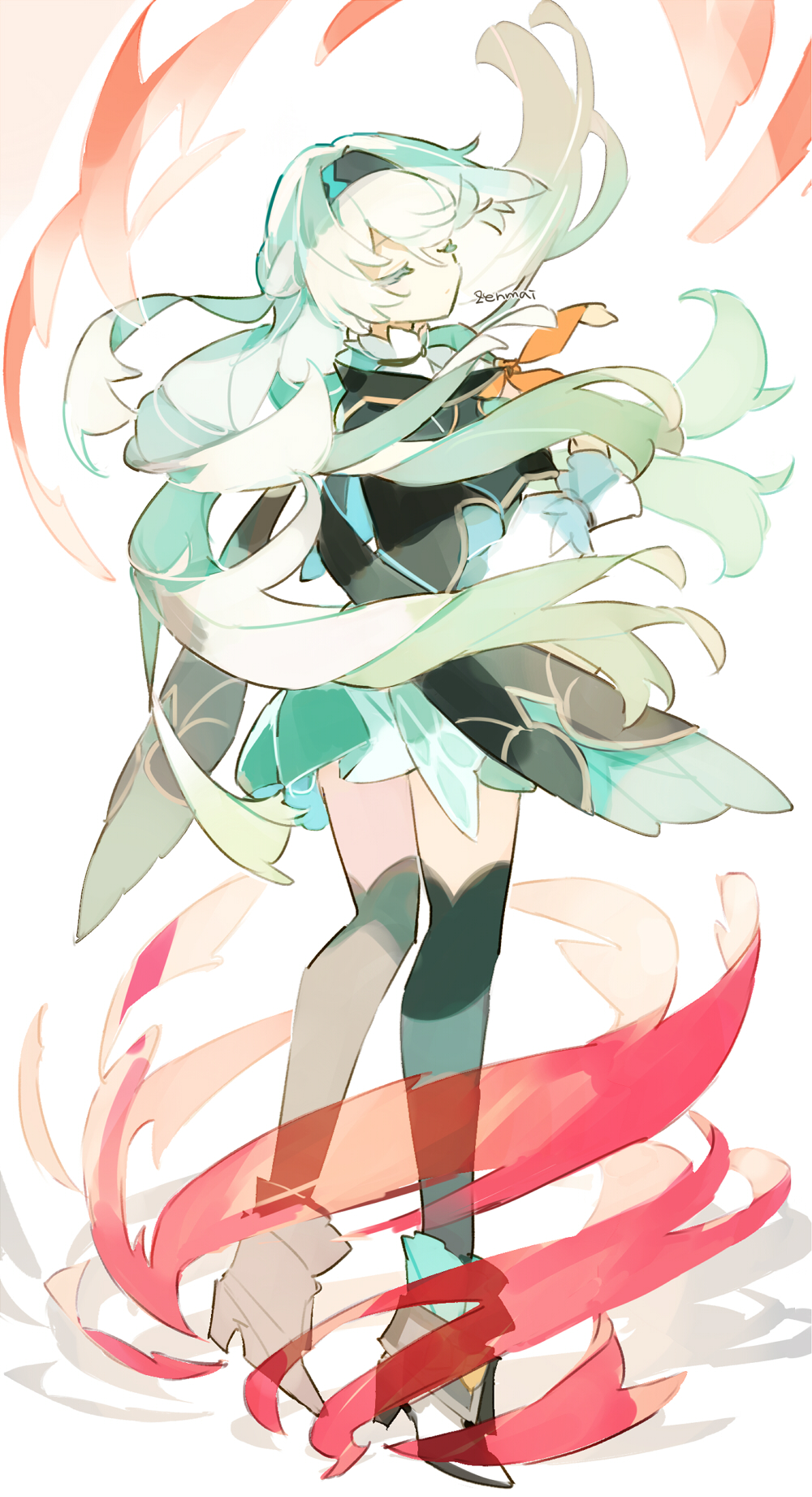1girl ankle_boots black_dress black_headband black_thighhighs boots closed_eyes commentary_request dress fire firefly_(honkai:_star_rail) floating_hair green_hair headband highres honkai:_star_rail honkai_(series) long_hair long_sleeves magic neckerchief orange_neckerchief simple_background solo thighhighs twitter_username white_background zenmai_(cyenmi3)