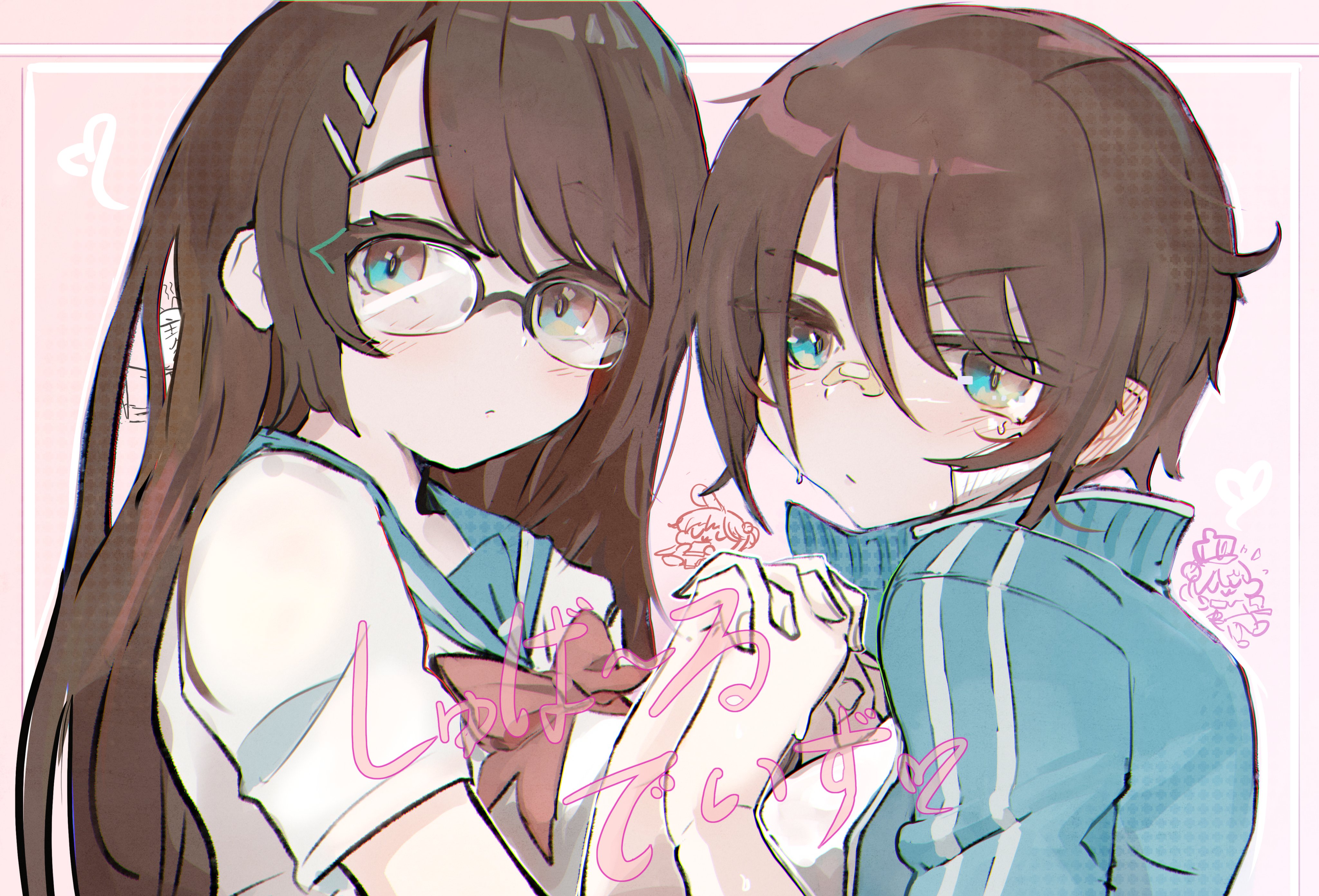 2girls absurdres alternate_costume aqua_eyes bandaid bandaid_on_face bandaid_on_nose blue_sailor_collar dual_persona glasses hair_between_eyes hair_ornament hairclip highres holding_hands hololive jacket long_hair looking_at_viewer multiple_girls nereb_72 oozora_subaru open_clothes open_jacket sailor_collar school_uniform serafuku short_hair track_jacket upper_body virtual_youtuber