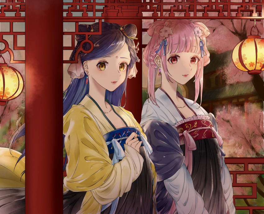 2girls alternate_costume blue_hair braid chinese_clothes double_bun earrings facial_mark flower forehead_mark hair_behind_ear hair_bun hair_ornament hanfu hannelore_(honzuki_no_gekokujou) honzuki_no_gekokujou jewelry lantern long_hair multiple_girls myne_(honzuki_no_gekokujou) parted_lips pink_flower pink_hair qixiong_ruqun red_eyes riririsa ruqun shawl smile swept_bangs tassel tassel_earrings tree upper_body yellow_eyes