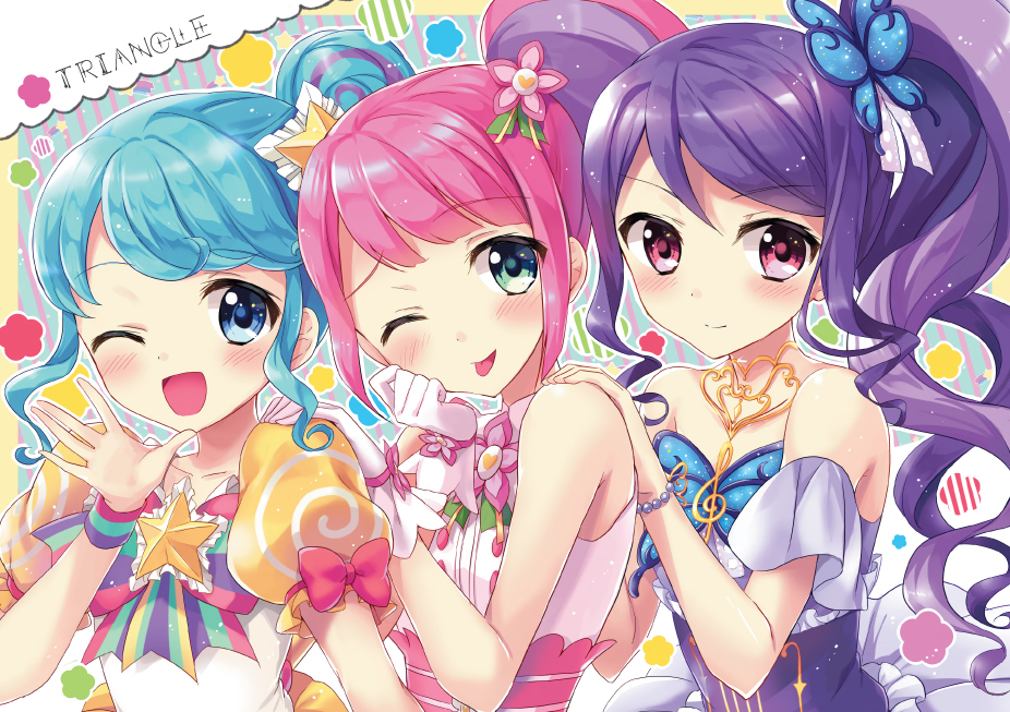 3girls ;d bad_id bad_pixiv_id bare_shoulders blue_eyes blue_hair blush butterfly_hair_ornament closed_mouth commentary_request flower gloves green_eyes group_name hair_bun hair_flower hair_ornament hand_on_another's_shoulder hand_on_own_cheek hand_on_own_face hand_up junon_(pripara) kanon_(pripara) kuguri_oimo long_hair looking_at_viewer multicolored_hair multiple_girls one_eye_closed open_mouth pink_flower pink_hair pinon_(pripara) pretty_series pripara puffy_short_sleeves puffy_sleeves purple_eyes purple_hair shirt short_sleeves side_ponytail sidelocks single_side_bun smile star_(symbol) star_hair_ornament streaked_hair tongue tongue_out treble_clef upper_body white_gloves white_shirt