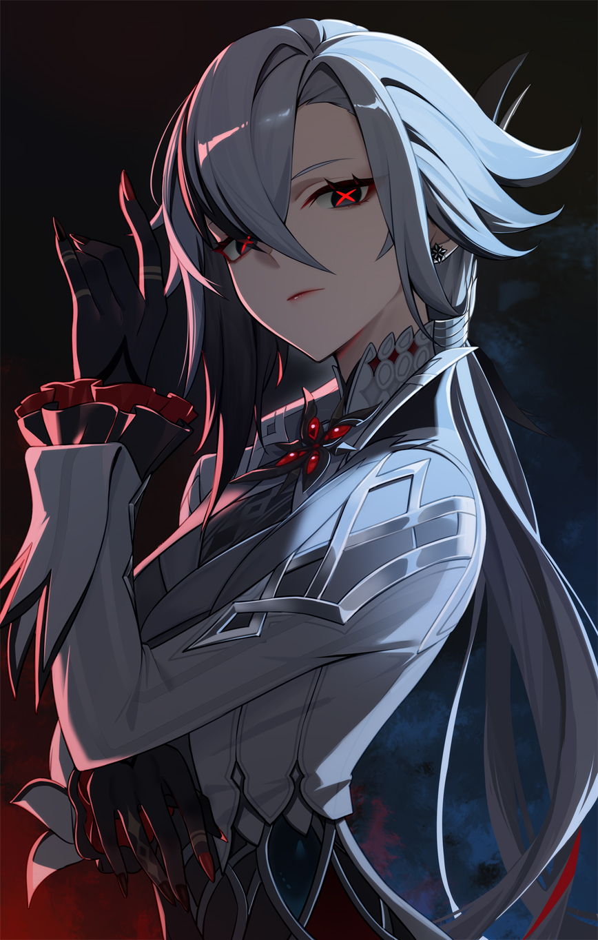 1girl arlecchino_(genshin_impact) black_eyes black_hair breasts genshin_impact gradient_background grey_hair hair_between_eyes highres long_hair long_sleeves looking_at_viewer medium_breasts multicolored_hair multiple_girls red_pupils short_hair solo streaked_hair symbol-shaped_pupils two-tone_hair tyenka7728 upper_body white_hair x-shaped_pupils