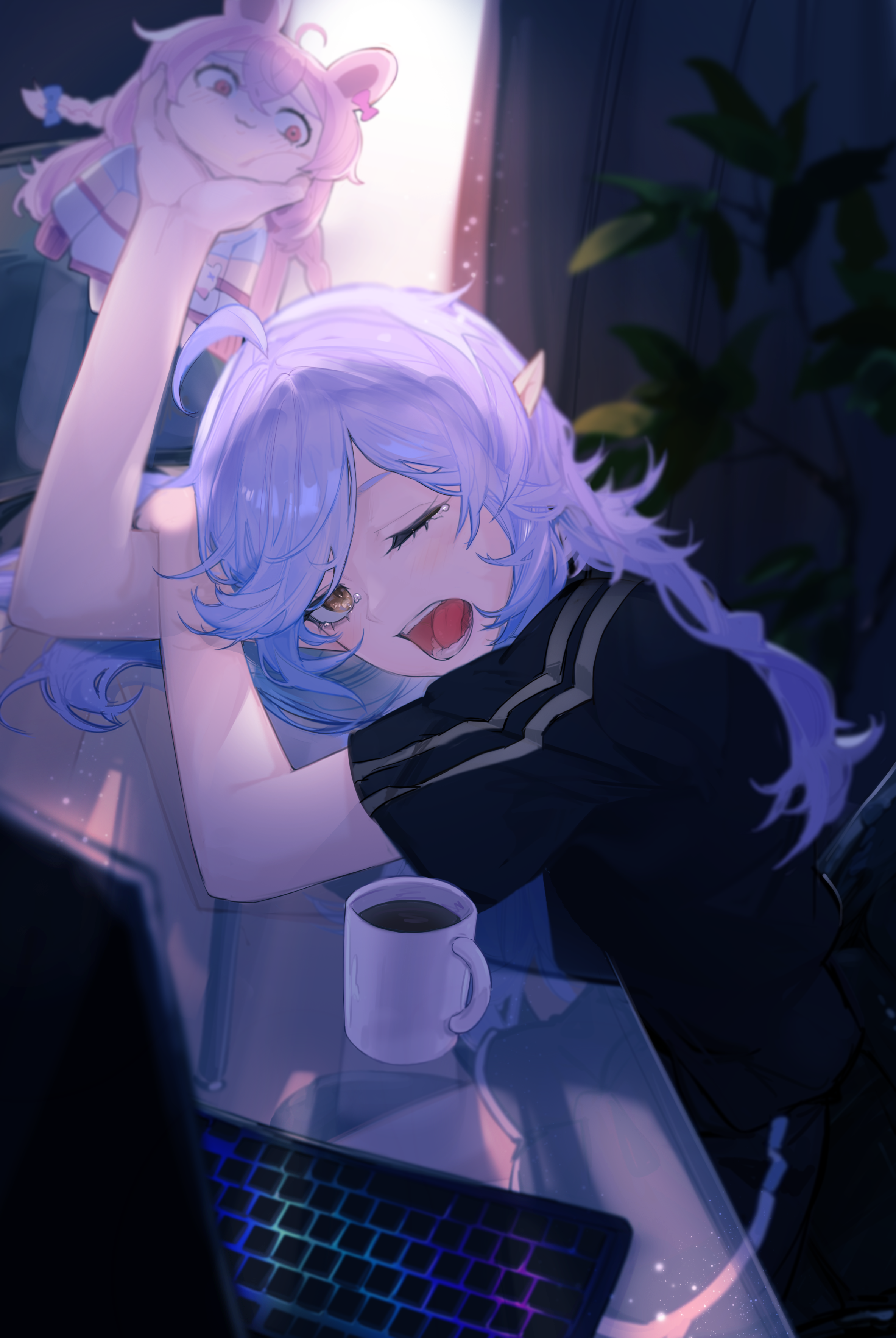 1girl absurdres ahoge animal_ears black_shirt black_shorts blue_bow bow braid character_doll coffee coffee_mug commission computer_keyboard cup desk doll ear_bow eepy_sleepy hair_bow highres indie_virtual_youtuber mug one_eye_closed open_mouth phase_connect pink_bow pink_hair pipkin_pippa pipkin_pippa_(1st_costume) plant purple_hair rabbit_ears rabbit_girl rakugaki_suruhito rgb_lights second-party_source see-through_clothes shirt shorts sleepy virtual_youtuber window yawning yellow_eyes