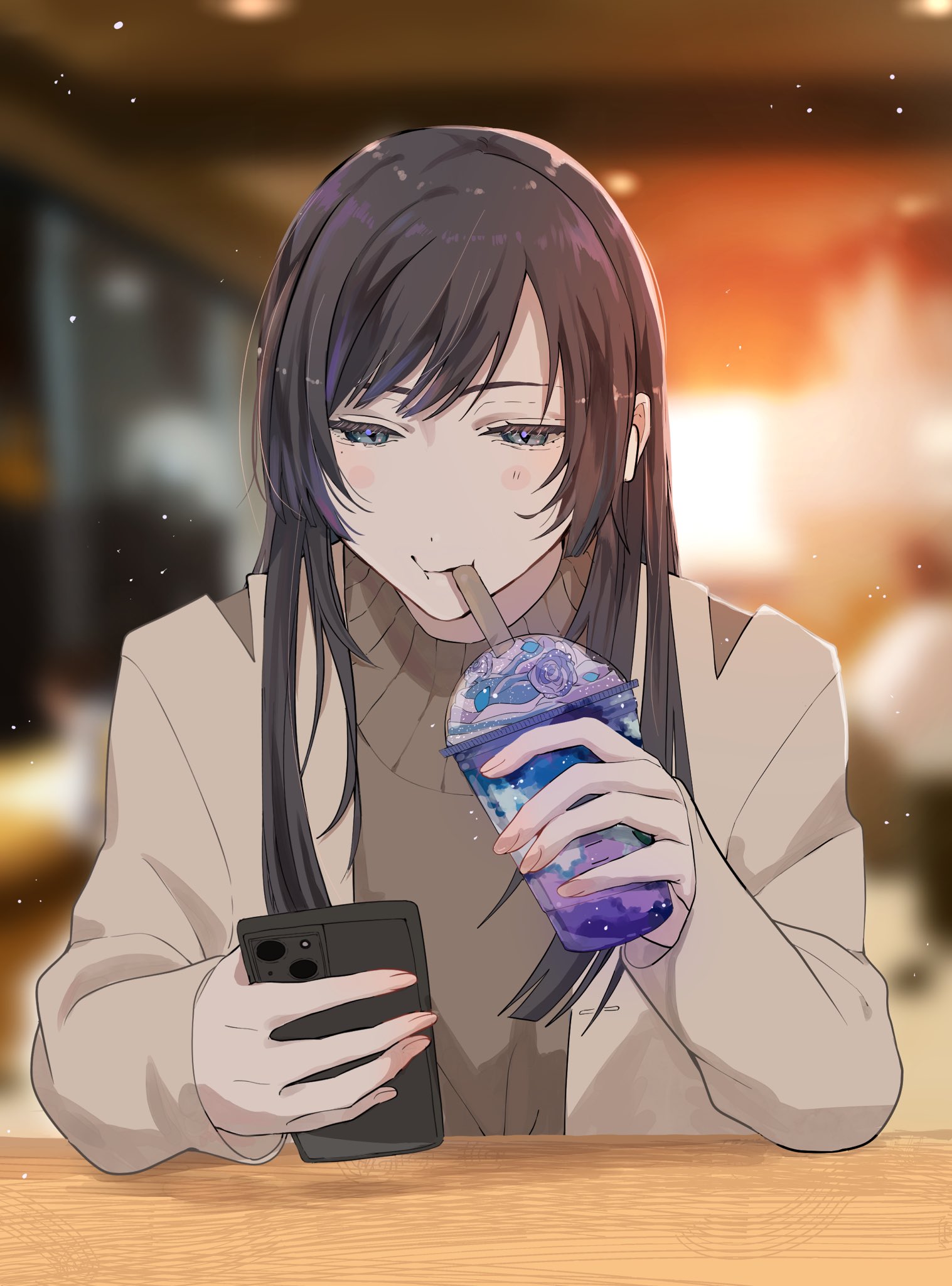 1girl ado_(utaite) black_hair blue_eyes blush brown_jacket brown_sweater casual cellphone chando_(ado) cloud_nine_inc commentary cup disposable_cup drinking_straw drinking_straw_in_mouth highres holding holding_cup holding_phone indoors jacket long_hair long_sleeves miyuu_3333 mole mole_under_eye open_clothes open_jacket phone smartphone solo sweater untranslatable_commentary utaite