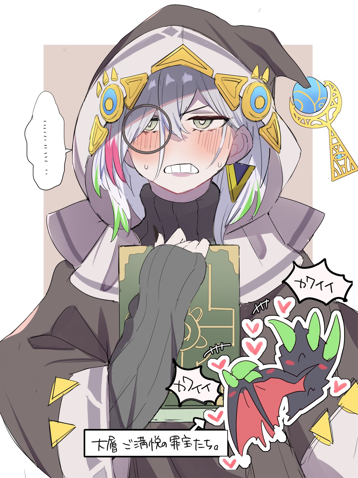 ... 1girl astellar_of_the_white_forest asteria_of_the_white_woods_(cosplay) black_sweater blush book brown_cloak cloak cosplay diabellstar_the_black_witch duel_monster earrings embarrassed green_eyes green_hair grey_hair hat highres holding holding_book jewelry monocle multicolored_hair official_alternate_costume soeji solo speech_bubble streaked_hair sweater upper_body witch_hat yu-gi-oh!
