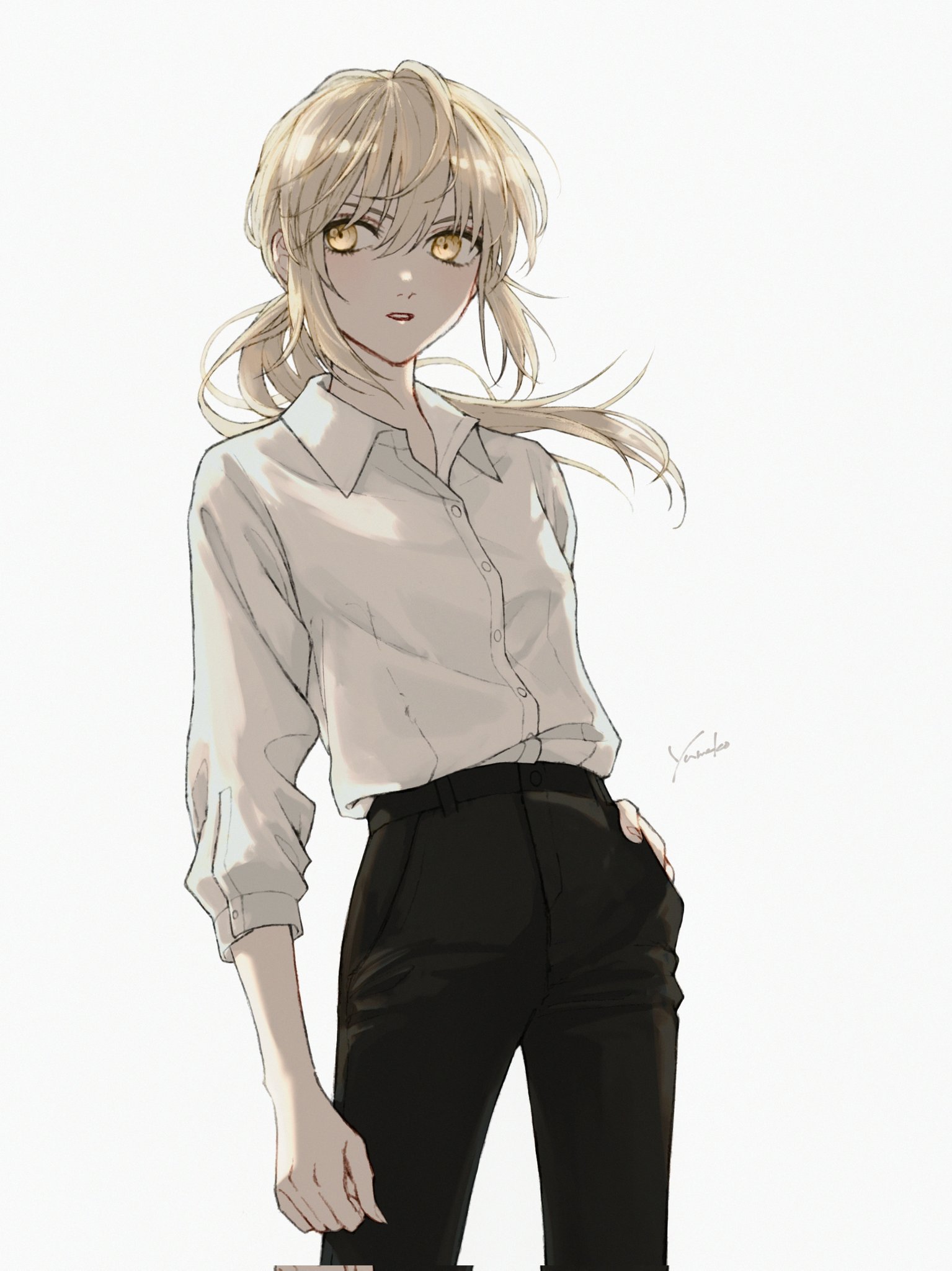 1girl alternate_costume artoria_pendragon_(fate) black_pants blonde_hair collared_shirt commentary_request corrupted_twitter_file fate/grand_order fate_(series) floating_hair hair_between_eyes highres low_ponytail pale_skin pants ponytail saber_alter shirt signature simple_background solo white_background white_shirt yellow_eyes yumeko_(fgo39625963)