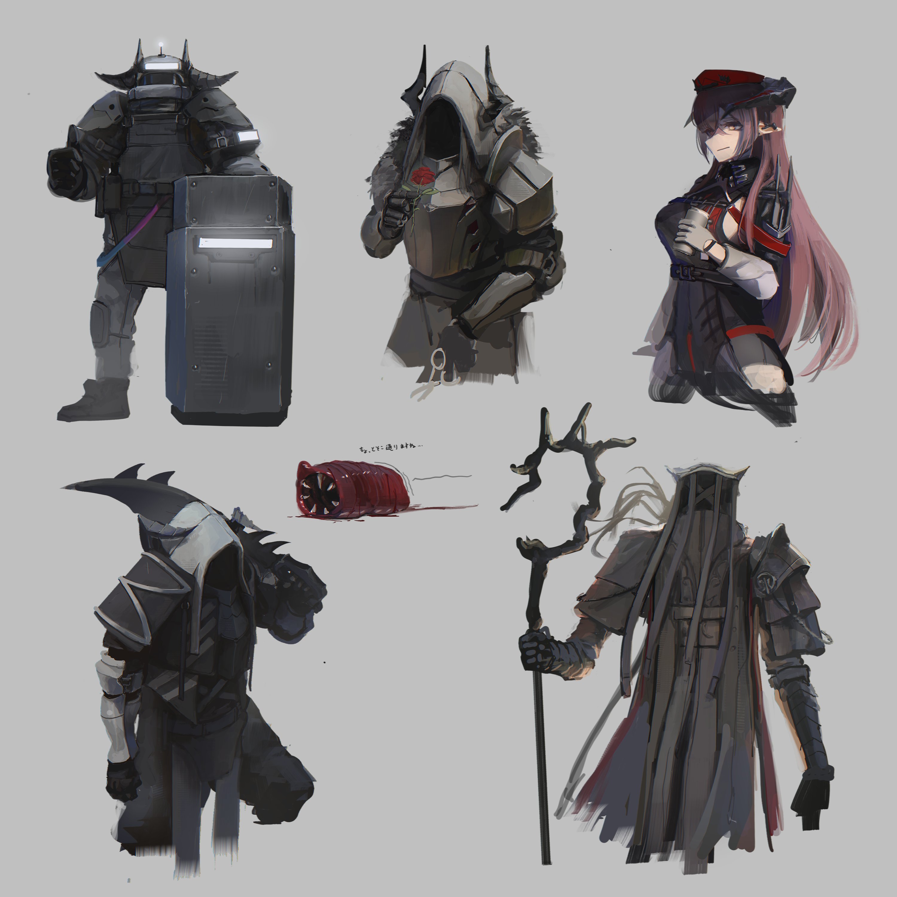 1girl 4others absurdres ambiguous_gender arknights armor beret black_dress black_gloves bomb_suit breastplate carrying_over_shoulder character_request cropped_legs dress face_in_shadow full_armor gloves grey_background hat helmet highres holding holding_staff holding_sword holding_weapon hood hood_up jacket kusami_toka_naku_au long_hair military_uniform monster multiple_others pauldrons pink_hair red_hat riot_shield shield shoulder_armor simple_background staff sword thumbs_up vambraces weapon white_gloves white_hood white_jacket yellow_eyes
