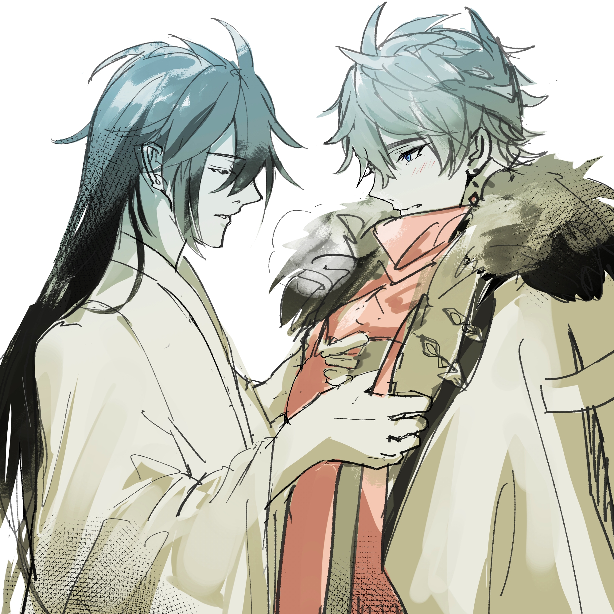 2boys alternate_costume alternate_hairstyle coat genshin_impact greyscale highres image_sample long_hair monochrome multiple_boys ntk_jz pixiv_sample robe scarf tartaglia_(genshin_impact) white_background winter_clothes winter_coat yaoi zhongli_(genshin_impact)
