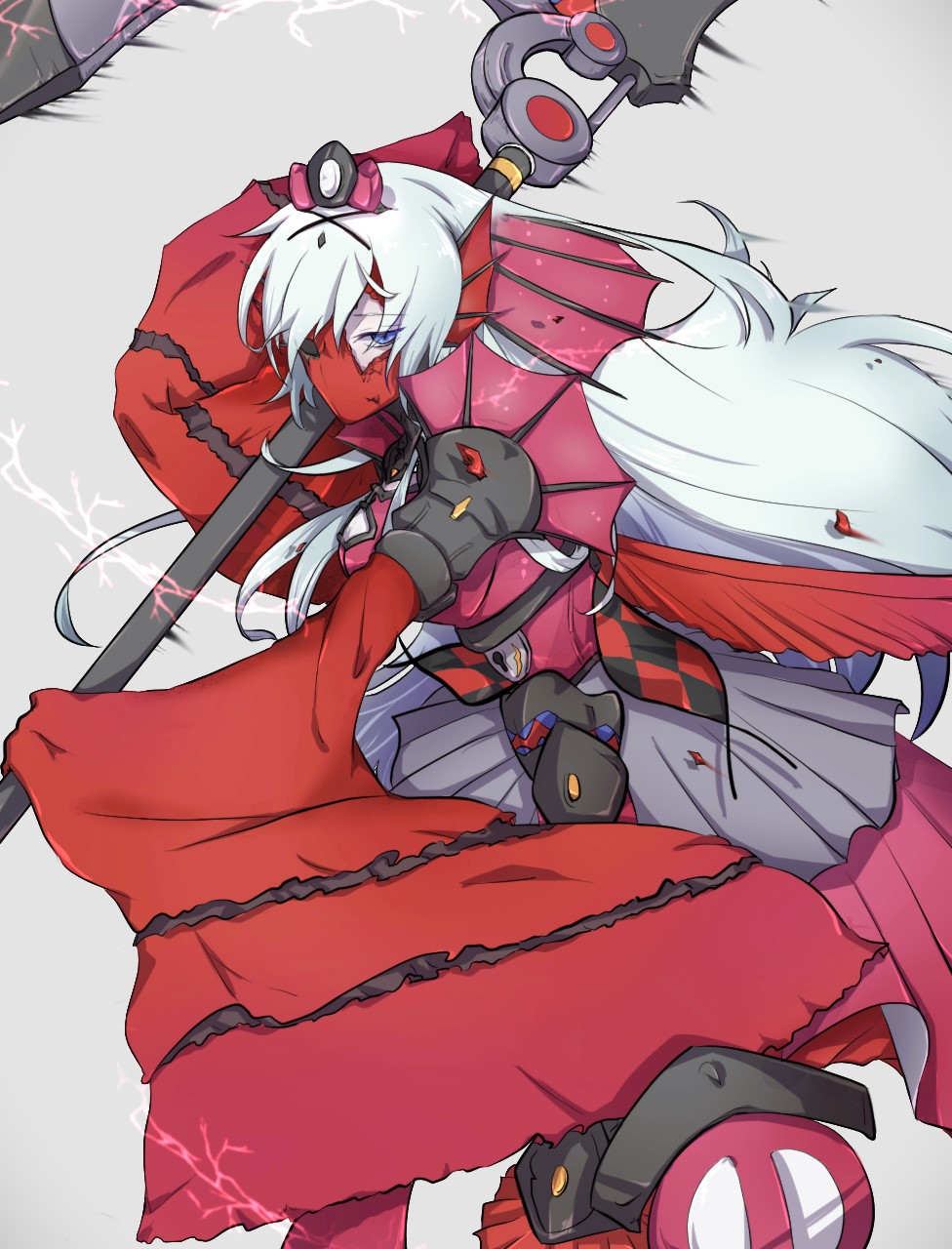 1girl blue_eyes broken_mask duel_monster expressionless fins green_hat hat head_fins highres holding holding_polearm holding_weapon kitkallos_(yu-gi-oh!) long_hair long_sleeves mask polearm red_theme skirt solo tearlaments_kashtira tiara weapon wide_sleeves yoruno_tori3 yu-gi-oh!