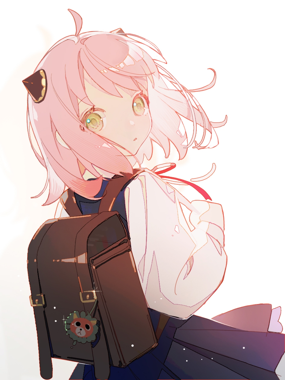 1girl 7tkei ahoge anya_(spy_x_family) backpack bag blue_dress child cowboy_shot dress from_behind green_eyes hairpods highres long_sleeves looking_at_viewer looking_back neck_ribbon parted_lips pinafore_dress pink_hair ribbon shirt short_hair simple_background sleeveless sleeveless_dress solo spy_x_family white_background white_shirt