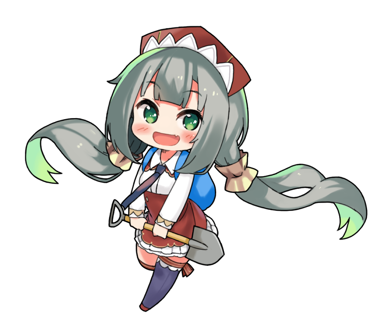 1girl azur_lane backpack bag black_thighhighs blush chibi dress fang full_body glowworm_(azur_lane) green_eyes green_hair grey_hair hat holding holding_shovel long_hair long_sleeves looking_at_viewer low_twintails moru_(monaka) multicolored_hair necktie open_mouth shovel simple_background solo thighhighs twintails very_long_hair white_background