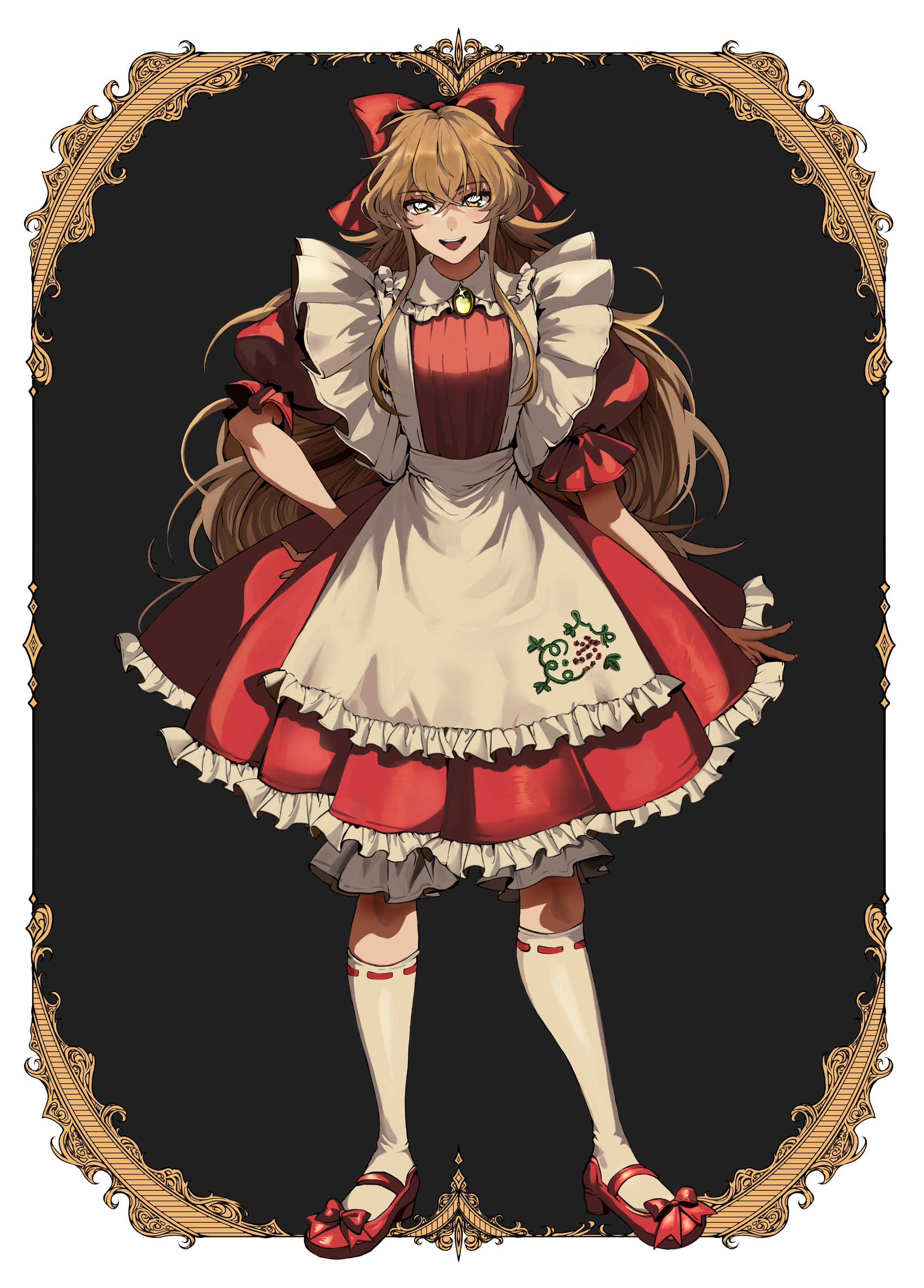 1girl absurdres apron black_background border bow brooch brown_hair crossed_bangs derre dress elise_liedl footwear_bow frilled_apron frilled_dress frilled_sleeves frills full_body glint hair_bow hand_on_own_hip highres inset_border jewelry kneehighs little_goody_two_shoes long_hair looking_at_viewer mary_janes open_mouth ornate_border puffy_short_sleeves puffy_sleeves red_dress red_shoes shoes short_sleeves sidelocks simple_background smile socks solo standing waist_apron white_apron white_socks yellow_eyes