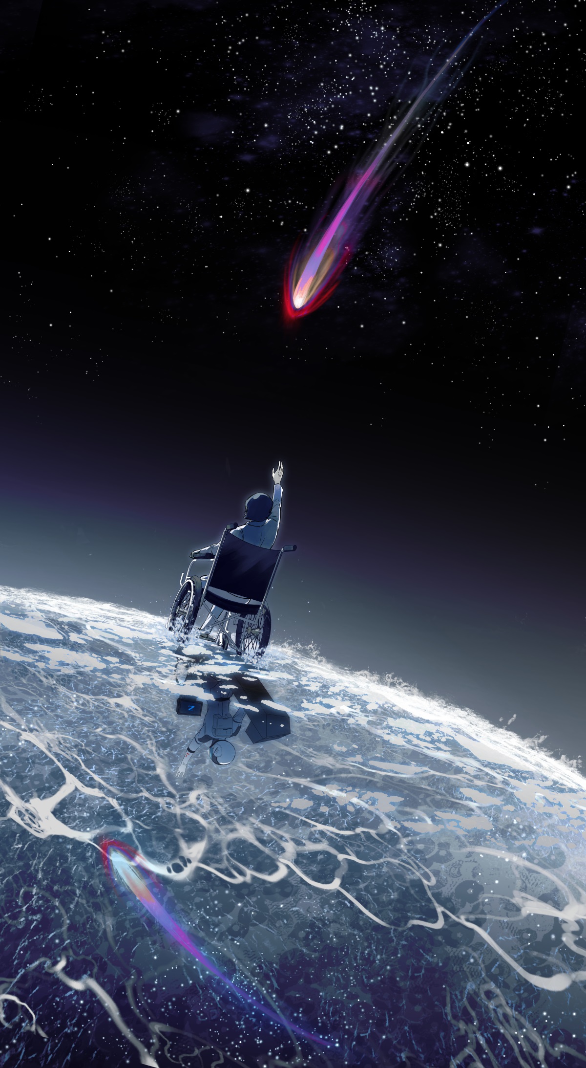 1boy arm_up blue_hair blue_pants blue_shirt cockpit comet different_reflection gundam gundam_zz helmet highres isara1014 kamille_bidan male_focus mecha_pilot_suit normal_suit_(gundam) outdoors pants pilot_suit reflection shirt short_hair sitting sky space space_helmet spacesuit star_(sky) starry_sky water wheelchair zeta_gundam