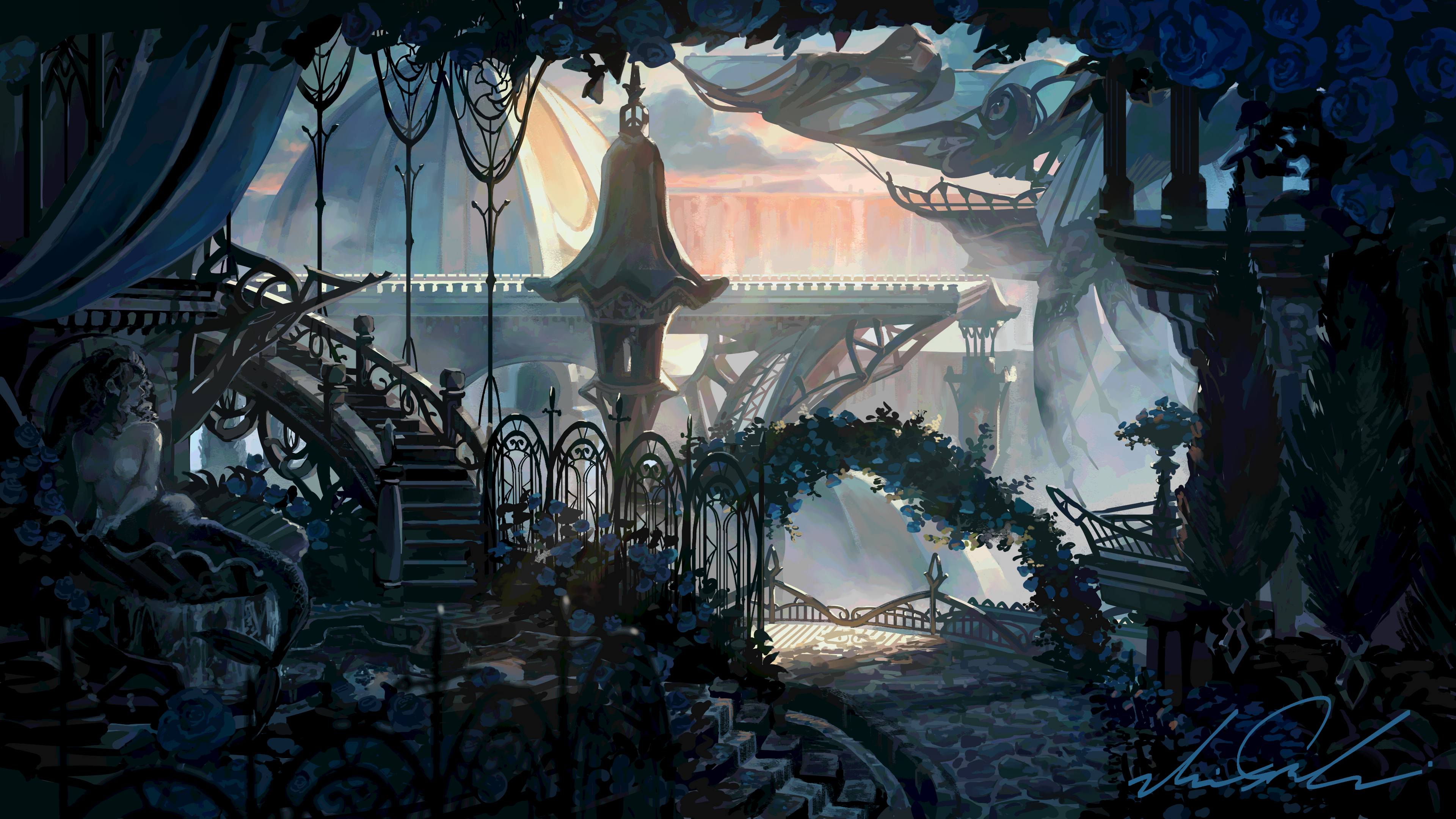 absurdres arch blue_flower bush cityscape column dark day dome fantasy fence flower garden hedge highres iron_fence nature no_humans original outdoors pillar scenery shigre signature spire statue stone_floor tree