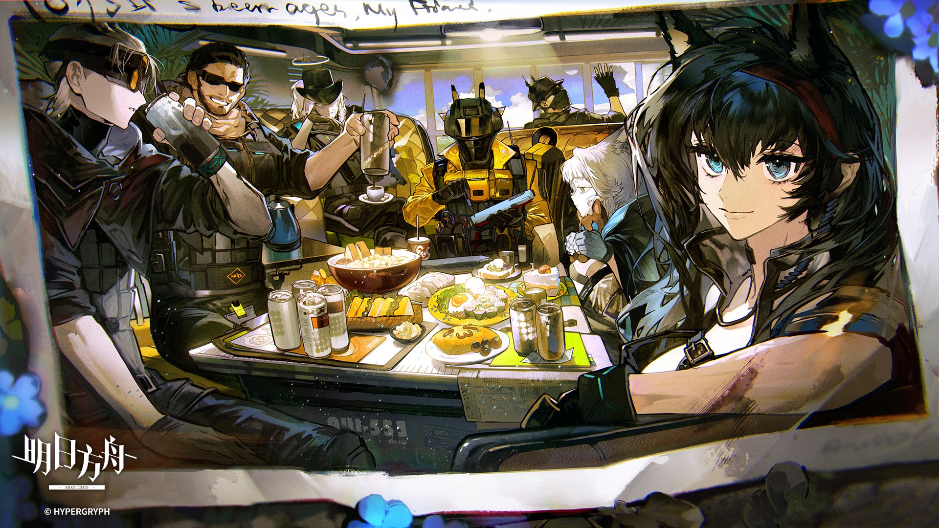 3girls 4boys ace_(arknights) arknights beard blaze_(arknights) facial_hair fingerless_gloves gloves group_picture highres holding holding_stuffed_toy infection_monitor_(arknights) looking_back mechanist_(arknights) misery_(arknights) multiple_boys multiple_girls nano_(c175311) outcast_(arknights) rosmontis_(arknights) scout_(arknights) smile stuffed_animal stuffed_rabbit stuffed_toy sunglasses table waving