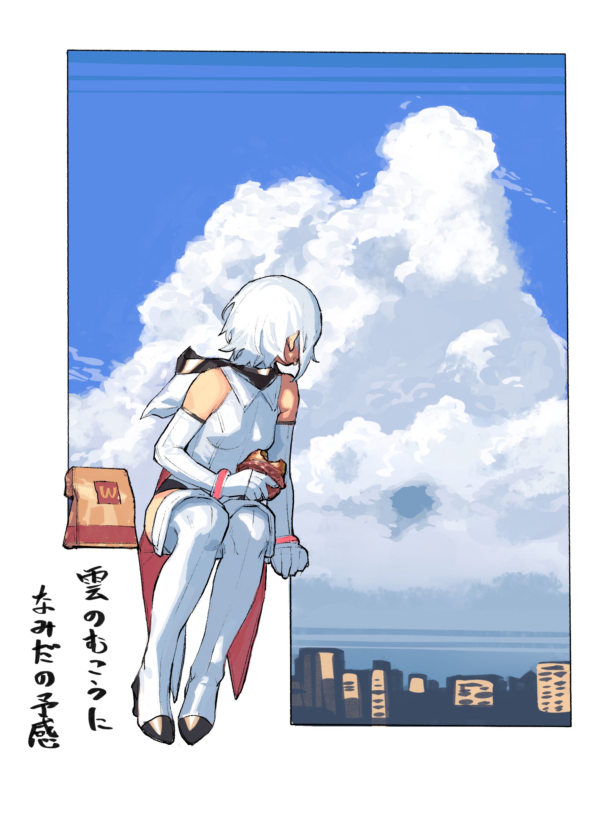 1girl absurdres bare_shoulders breasts bukimi_isan city cloud food gloves high_heels highres holding holding_food hood hood_down leotard looking_back short_hair shy_(character) shy_(series) small_breasts solo thighhighs wcdonald's white_gloves white_hair white_leotard white_thighhighs