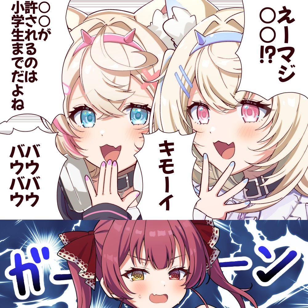 3girls :3 :d @_@ animal_collar animal_ear_fluff animal_ears belt_collar black_collar blonde_hair blue_eyes blue_hair blue_hairband blue_nails blush collar commentary_request crossed_bangs dog_ears dog_girl double-parted_bangs fake_horns fang fuwawa_abyssgard fuwawa_abyssgard_(1st_costume) hair_between_eyes hair_intakes hair_ornament hair_ribbon hairband hairclip hand_on_own_chin headphones headphones_around_neck heterochromia hololive hololive_english horns houshou_marine houshou_marine_(1st_costume) kimoi_girls_(meme) laughing long_hair long_sleeves looking_at_viewer meme mococo_abyssgard mococo_abyssgard_(1st_costume) multicolored_hair multiple_girls nail_polish no_eyepatch open_mouth parody pink_eyes pink_hair pink_hairband pink_nails red_eyes red_hair ribbon shirt short_hair siblings sisters skin_fang smile smug speech_bubble streaked_hair sweat torinokawori translation_request twins twintails two-tone_hair two_side_up virtual_youtuber white_shirt x_hair_ornament yellow_eyes