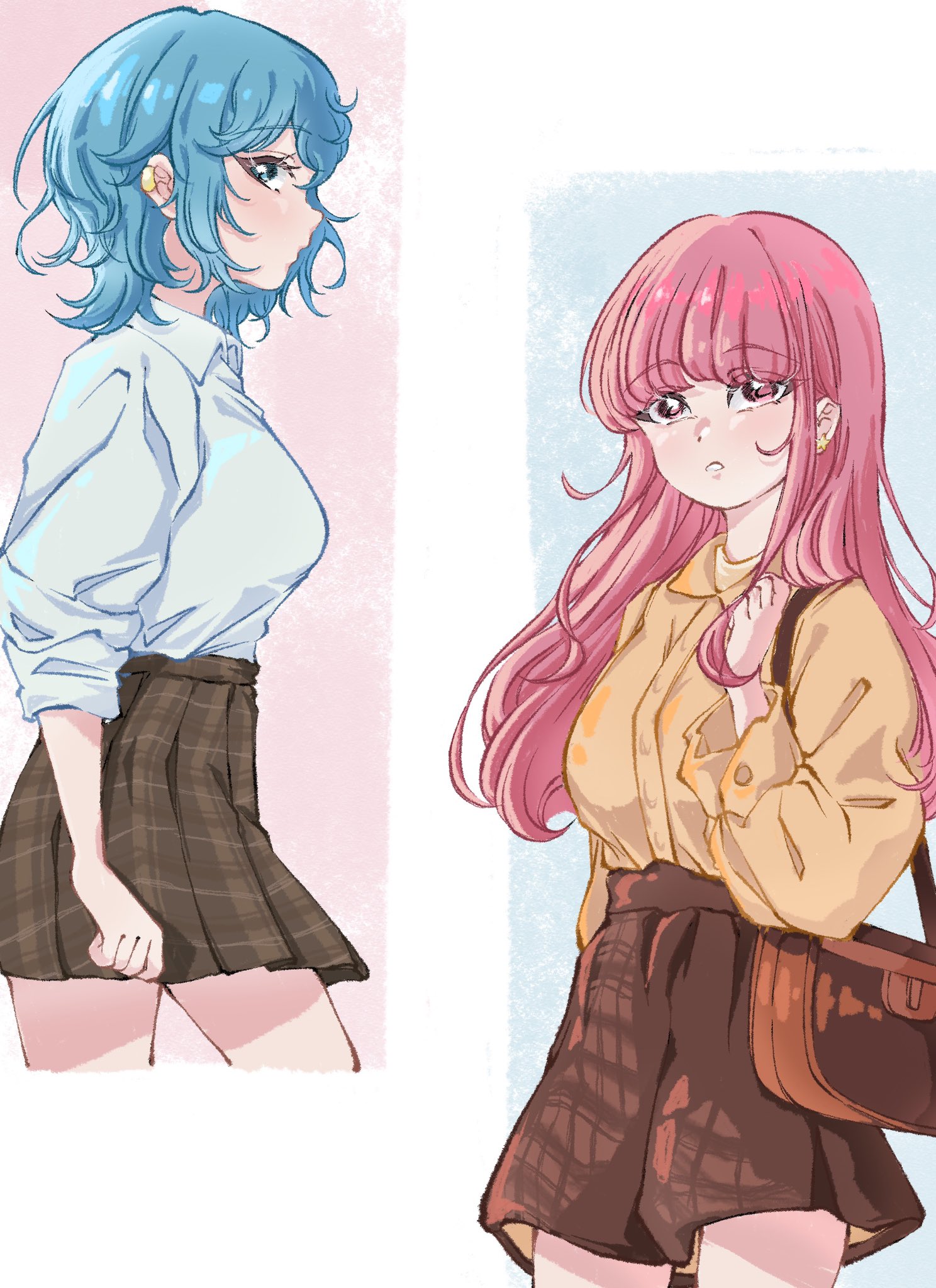2girls asahina_yuni bag blue_eyes blue_hair blue_shirt breasts brown_bag brown_shirt brown_skirt collared_shirt commentary cropped_legs dress_shirt earrings hashtag-only_commentary highres jewelry kyou_wa_kanojo_ga_inai_kara long_hair looking_at_viewer medium_breasts medium_hair multiple_girls open_mouth pink_hair plaid_clothes plaid_skirt pleated_skirt rorol_reime school_uniform shirt shirt_tucked_in shoulder_bag sidelocks skirt three-quarter_sleeves sleeves_rolled_up star_(symbol) star_earrings taki_fuuko wolf_cut