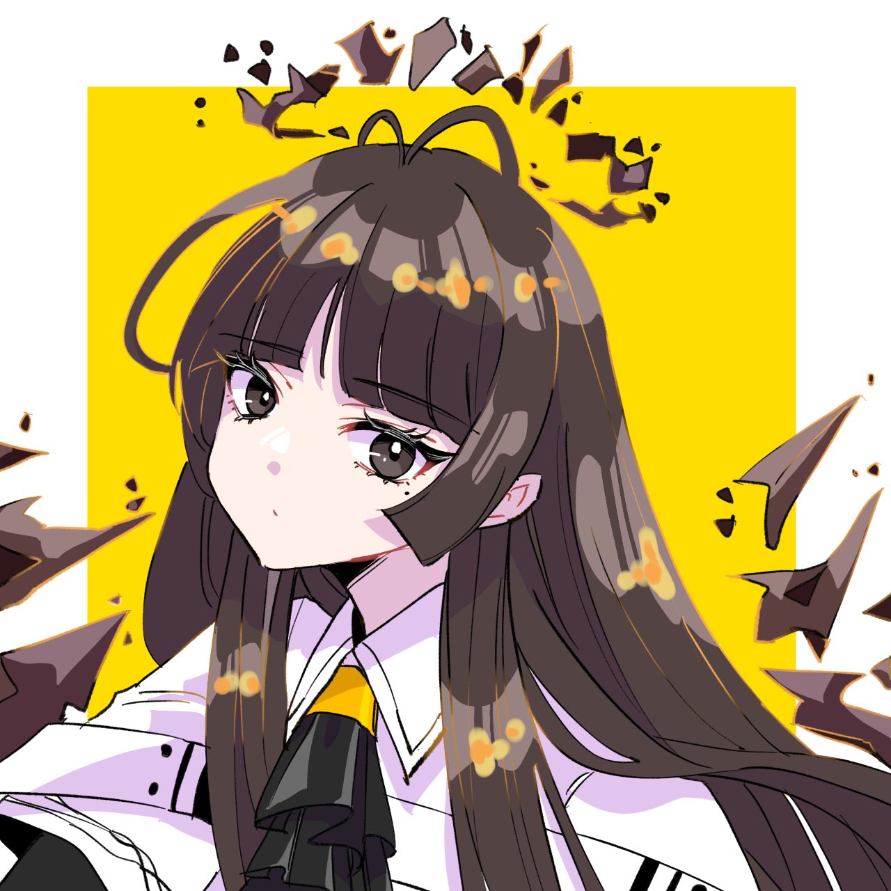 1girl antenna_hair arknights ascot black_ascot blunt_bangs border broken_halo brown_eyes brown_hair brown_halo brown_wings chomo_o12 closed_mouth collared_jacket commentary_request dark_halo detached_wings energy_wings expressionless eyelashes halo highres hime_cut jacket long_hair looking_at_viewer looking_to_the_side mole mole_under_eye shadow short-sleeved_jacket short_sleeves sidelocks simple_background solo standing straight_hair strap upper_body virtuosa_(arknights) white_border white_jacket wide_sleeves wing_collar wings yellow_background