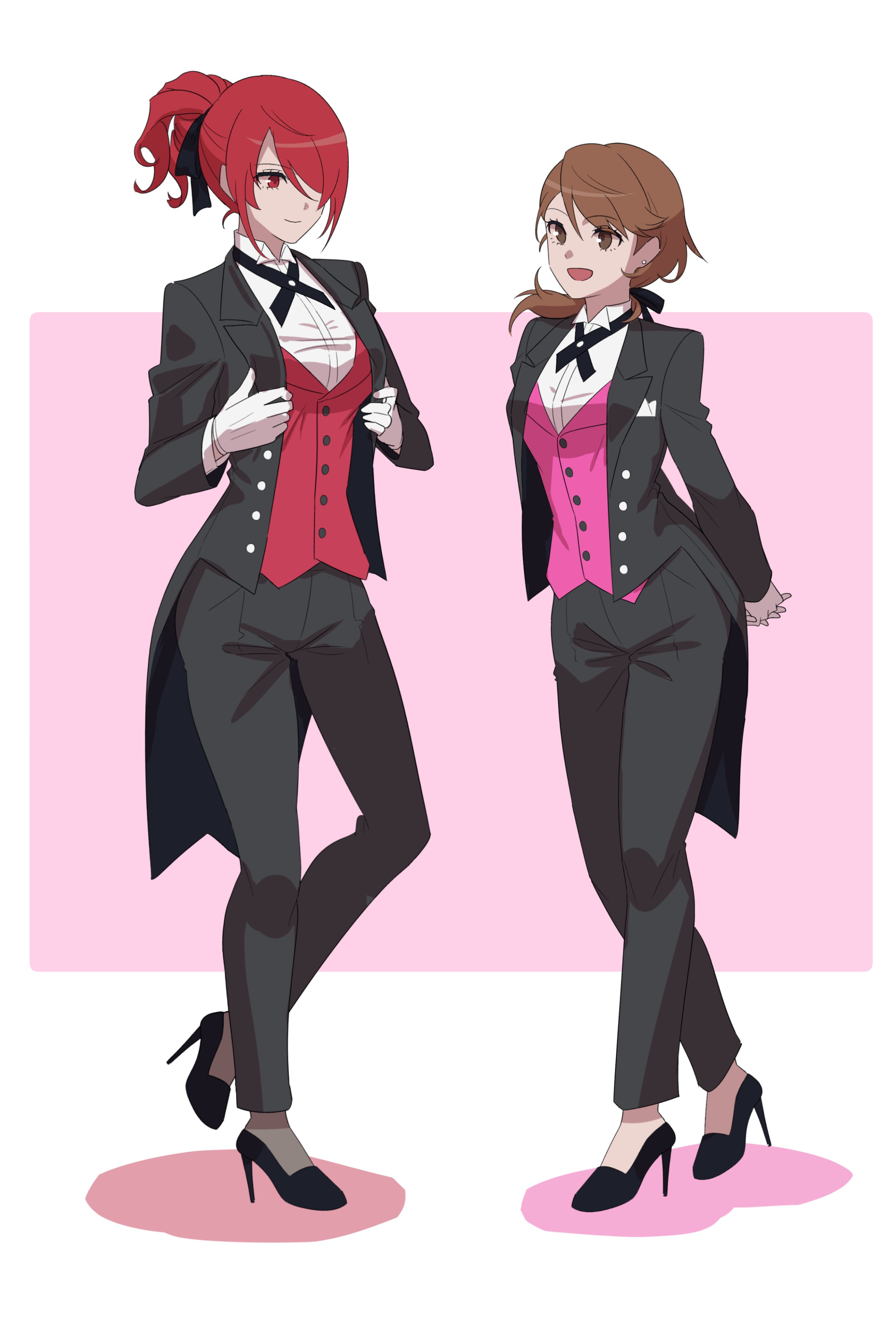 2girls absurdres alternate_costume arms_behind_back black_footwear black_jacket black_pants black_ribbon black_suit breasts brown_eyes brown_hair butler buttons closed_mouth coattails collared_shirt commentary_request crossdressing crossdressing_(ftm) dress_shirt earrings female_butler formal_clothes full_body gloves hair_over_one_eye hair_ribbon high_heels high_ponytail highres jacket jewelry kirijou_mitsuru long_hair long_sleeves looking_at_another low_ponytail medium_breasts medium_hair multiple_girls neck_ribbon open_clothes open_jacket open_mouth pants persona persona_3 persona_3_reload pink_vest po_su_su ponytail red_eyes red_hair red_vest ribbon shirt smile standing stud_earrings suit tailcoat takeba_yukari vest white_gloves white_shirt