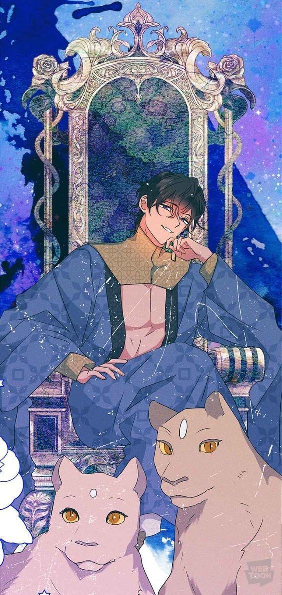 1girl amon_akin blonde_hair blue_pants blue_shirt long_hair looking_at_viewer my_gently_baised_beast open_clothes open_mouth open_shirt pants purple_eyes shirt sitting smile solo throne