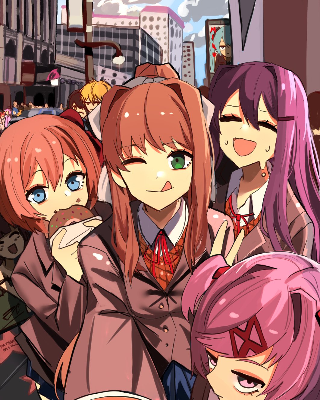 1boy 6+girls aqua_eyes aqua_hair blonde_hair blue_eyes blue_hair bocchi_the_rock! bow brown_hair closed_eyes crossover doki_doki_literature_club donut dress eating food food_on_face gotoh_hitori green_dress green_eyes hair_bow hair_intakes hair_ornament hair_ribbon hairclip hatsune_miku highres hiroi_kikuri holding holding_donut holding_food ijichi_nijika kessoku_band kita_ikuyo melting monika_(doki_doki_literature_club) multiple_crossover multiple_girls mykokampfwagen natsuki_(doki_doki_literature_club) one_eye_closed photobomb pink_eyes pink_hair pleated_skirt ponytail purple_hair red_bow red_hair ribbon sayori_(doki_doki_literature_club) school_uniform selfie short_twintails skirt sleeveless sleeveless_dress sweat tongue tongue_out twintails v vocaloid white_ribbon yamada_ryo yuri_(doki_doki_literature_club)