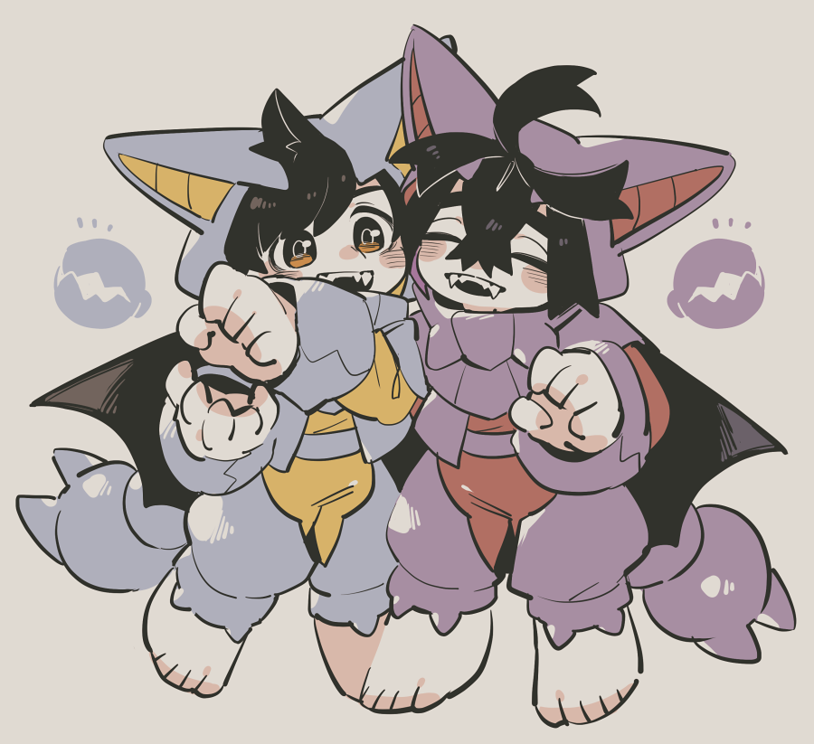 2boys ahoge alternate_color animal_ear_hood animal_ears arm_up barefoot black_eyes black_hair blush brown_eyes clenched_hand closed_eyes colored_inner_hair commentary_request crossed_bangs fake_animal_ears fangs florian_(pokemon) full_body gen_4_pokemon gliscor hair_between_eyes hairband hands_up hood kieran_(pokemon) long_sleeves looking_at_another lunchbox_(artist) male_focus multicolored_eyes multicolored_hair multicolored_pajamas multiple_boys nintendo notice_lines onesie open_mouth pajamas pokemon pokemon_scarlet_and_violet purple_hair sharp_teeth shiny_pokemon short_hair standing teeth two-tone_eyes two-tone_hair upper_teeth_only white_background wings yaoi