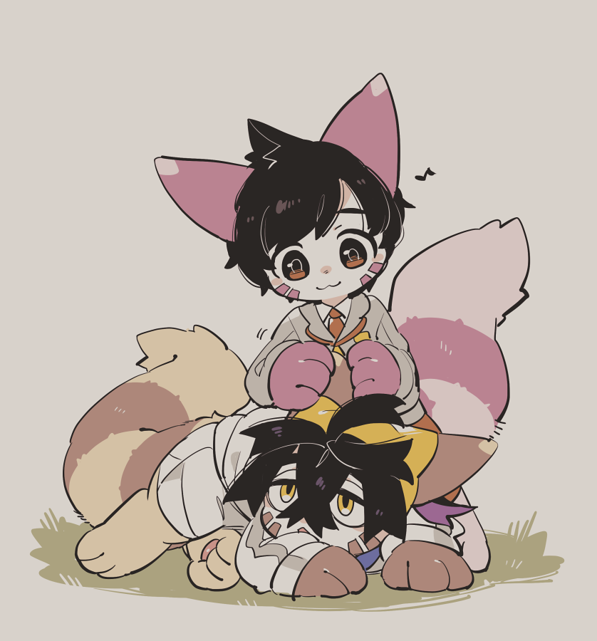 2boys :< :3 ahoge alternate_color animal animal_ears animal_hands black_eyes black_hair blue_jacket body_fur brown_eyes brown_fur closed_mouth collared_shirt commentary_request crossed_bangs facial_mark fewer_digits florian_(pokemon) full_body furret gen_2_pokemon grabbing_another's_ear grass grey_jacket hair_between_eyes hairband hand_on_another's_ear jacket kemonomimi_mode kieran_(pokemon) looking_at_another looking_down looking_up lunchbox_(artist) lying male_focus multicolored_eyes multicolored_hair multicolored_jacket multiple_boys musical_note necktie nintendo on_stomach open_mouth orange_necktie orange_pants pants paw_print pawpads pink_fur playing_with_another's_ears pokemon pokemon_(creature) pokemon_scarlet_and_violet purple_fur purple_hair shiny_pokemon shirt short_hair shorts simple_background smile tail two-tone_eyes two-tone_hair whisker_markings white_background white_jacket white_shirt white_shorts yaoi yellow_eyes yellow_hairband