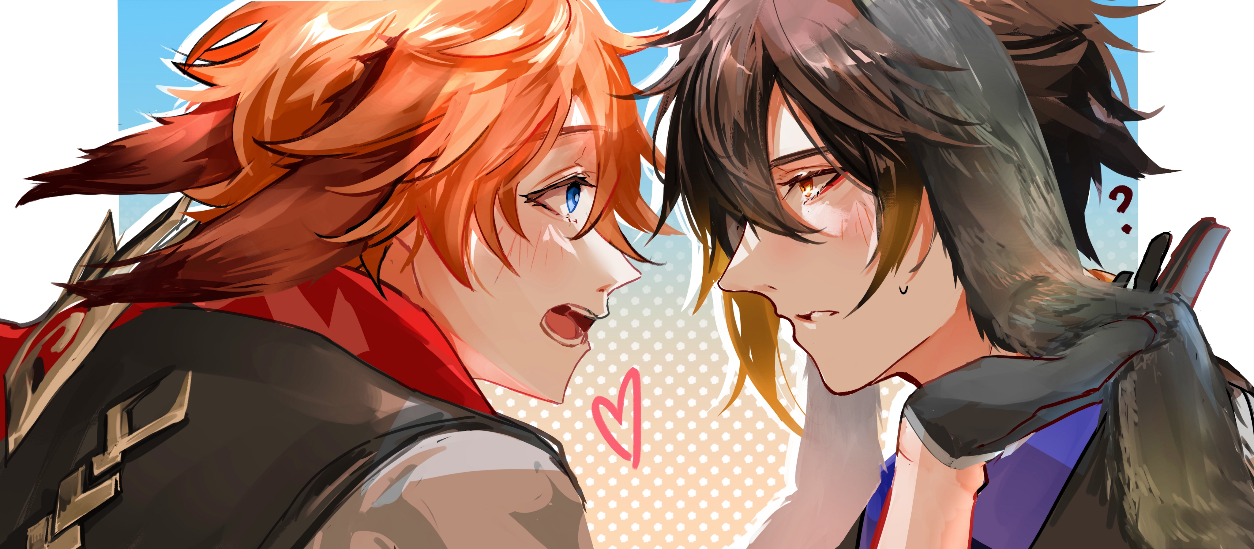 2boys absurdres animal_ears blush eyeliner fox_ears genshin_impact hands_on_another's_ears heart highres image_sample makeup multiple_boys ntk_jz open_mouth pixiv_sample rabbit_ears red_eyeliner simple_background tartaglia_(genshin_impact) yaoi zhongli_(genshin_impact)