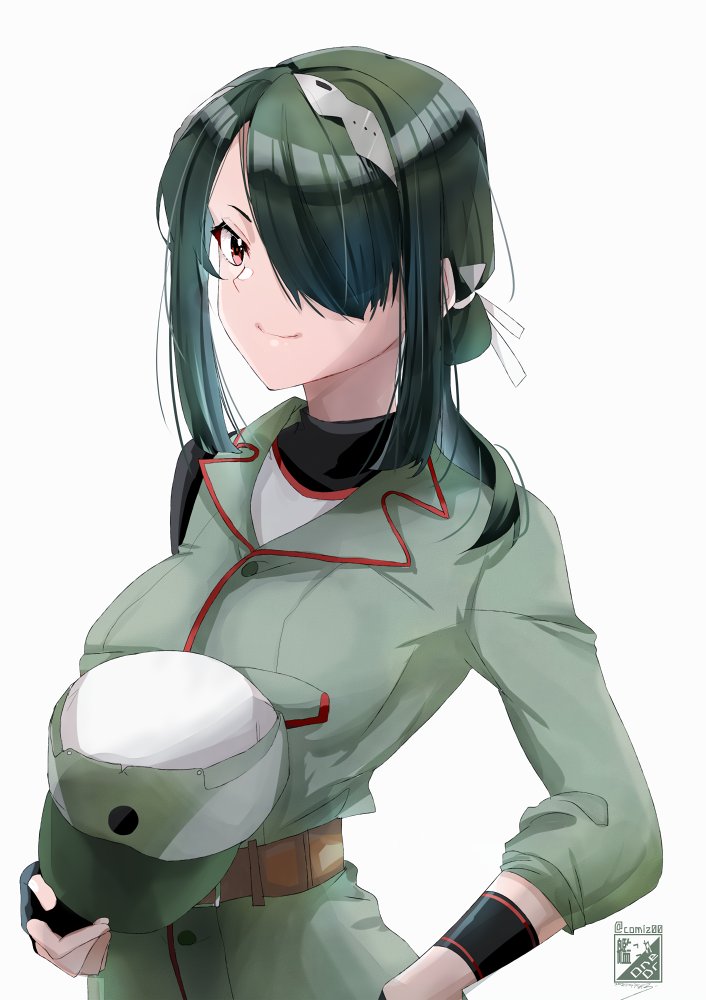 1girl belt black_gloves black_hair brown_belt gloves green_jacket hair_over_one_eye hair_over_shoulder hat headgear jacket kantai_collection kimura_shiki kumano_maru_(kancolle) long_hair looking_at_viewer military_jacket military_uniform one-hour_drawing_challenge red_eyes simple_background solo upper_body white_background white_hat