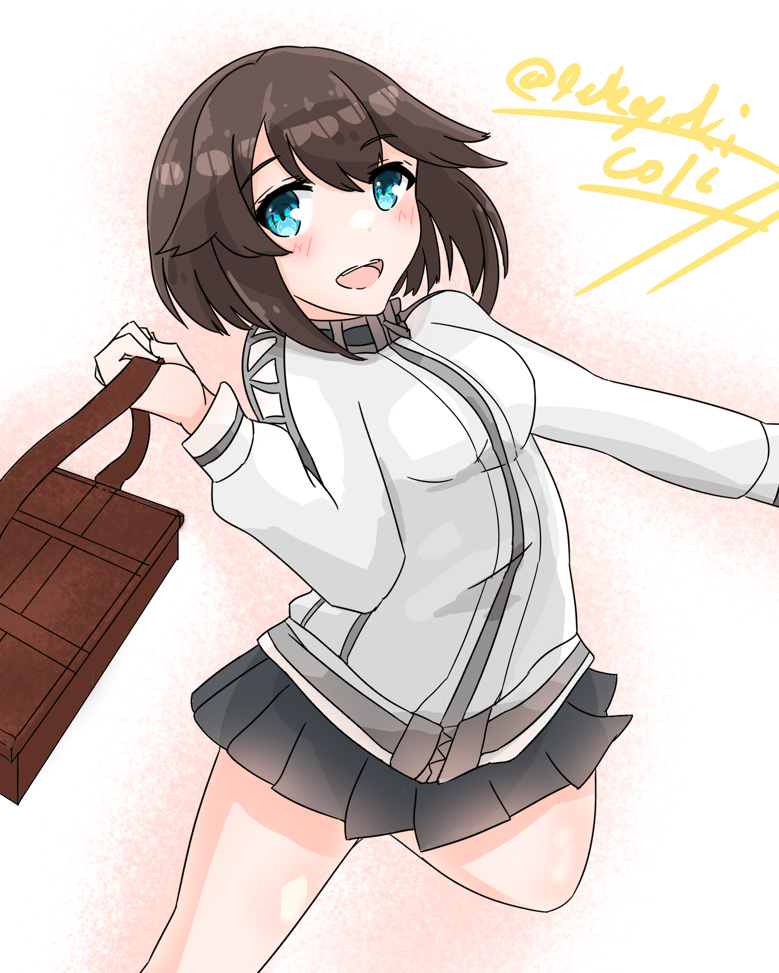 1girl aqua_eyes bag black_hair black_skirt coic_hakushaku cowboy_shot hayasui_(kancolle) highres jacket kantai_collection pleated_skirt running short_hair skirt smile solo track_jacket twitter_username white_jacket