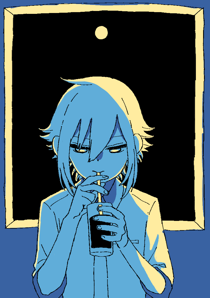 1boy closed_mouth collared_shirt commentary_request cup drinking drinking_glass drinking_straw drinking_straw_in_mouth famiresu_wo_kyouju_seyo full_moon hair_between_eyes half-closed_eyes holding holding_cup indoors koze_niire limited_palette looking_down male_focus moon necktie night nijisanji parody shirt short_hair short_sleeves sidelighting sidelocks solo straight-on style_parody upper_body uzuki_kou uzuki_kou_(3rd_costume) virtual_youtuber window
