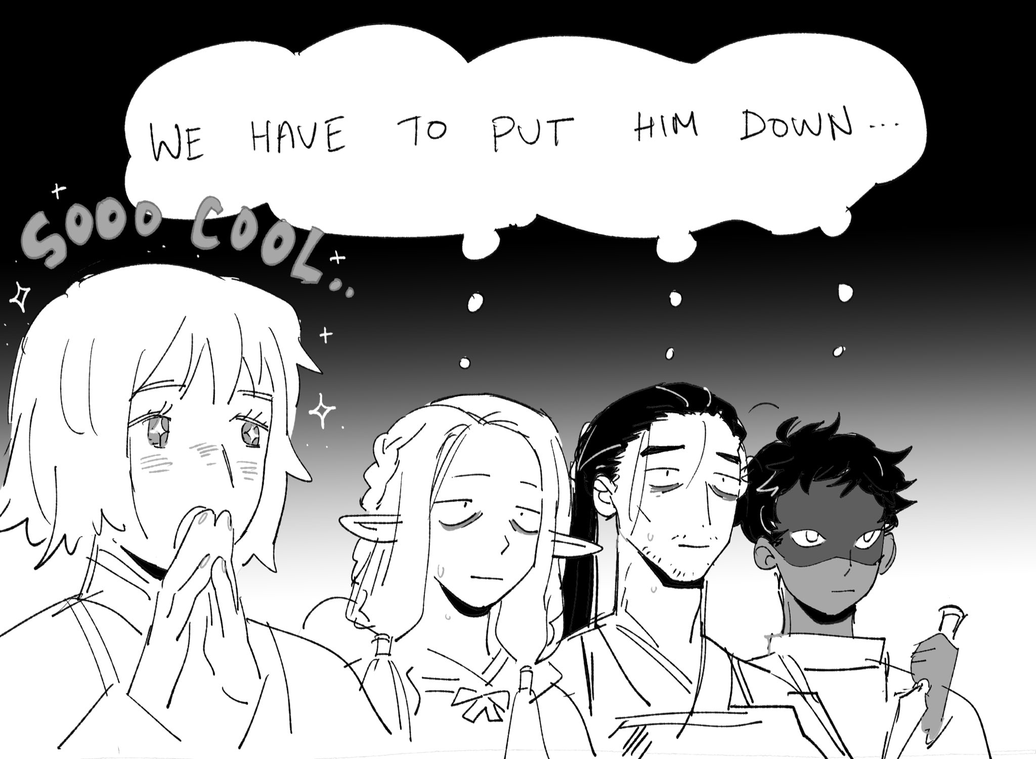 +_+ 2boys 2girls bags_under_eyes black_background commentary dagger dark-skinned_male dark_skin dungeon_meshi elf english_commentary english_text falin_touden gradient_background greyscale hand_to_own_mouth hand_up highres holding holding_dagger holding_knife holding_weapon kabru knife long_hair low_twintails marcille_donato monochrome multiple_boys multiple_girls open_mouth own_hands_together pointy_ears ponytail shared_thought_bubble short_hair shurou simple_background speech_bubble thought_bubble twintails very_short_hair weapon ylisseantactics