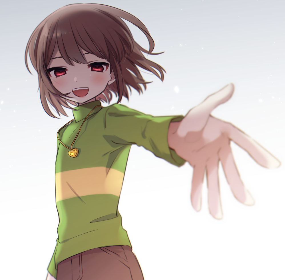 1other arm_at_side blush bob_cut brown_hair brown_pants chara_(undertale) foreshortening gradient_background green_sweater grey_background half-closed_eyes heart heart_necklace jewelry leftporygon long_sleeves looking_at_viewer necklace open_mouth outstretched_arm pants reaching reaching_towards_viewer red_eyes short_hair smile solo striped_clothes striped_sweater sweater teeth turtleneck turtleneck_sweater undertale upper_body upper_teeth_only utdr_(toby_fox) white_background wind yellow_sweater