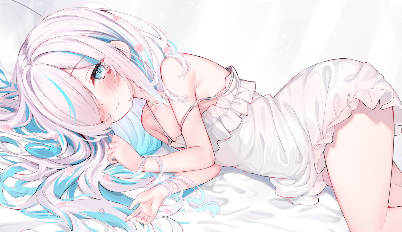 1girl aqua_hair bare_shoulders bed_sheet blue_eyes dress eip_(pepai) facial_mark frilled_dress frills grey_hair hair_ornament hair_over_one_eye heart heart_facial_mark ilu_fluor indie_virtual_youtuber long_hair looking_at_viewer lying multicolored_hair on_side simple_background sleeveless sleeveless_dress solo streaked_hair two-tone_hair virtual_youtuber white_dress