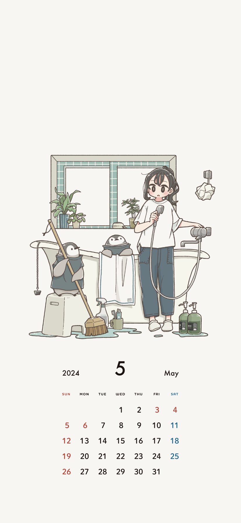 1girl bathroom bathtub bird black_eyes black_hair blue_pants blush broom calendar_(medium) east_sha2 full_body highres holding holding_broom holding_shower_head long_hair long_sleeves looking_at_animal original pants penguin plant ponytail potted_plant puddle shampoo_bottle shirt shower_head sidelocks simple_background solo stool towel white_background white_shirt window