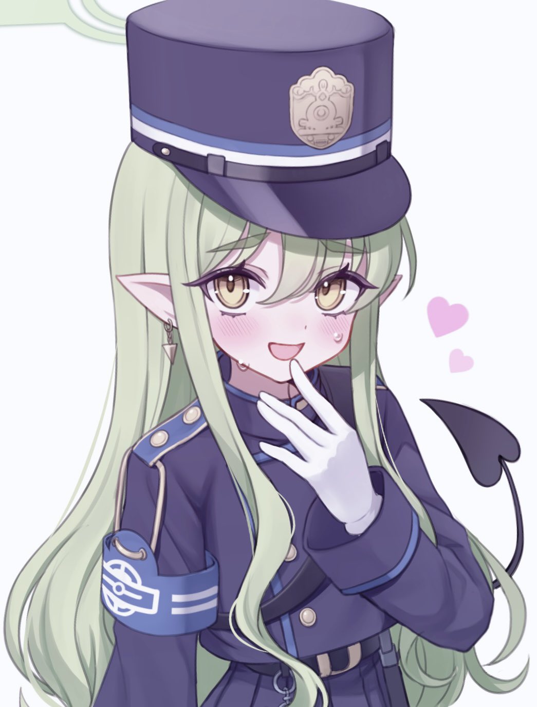 1girl \||/ belt black_belt blonde_hair blue_archive blue_hair blue_jacket blue_skirt demon_tail earrings gloves green_halo halo hat heart highres hikari_(blue_archive) jacket jewelry long_hair long_sleeves looking_at_viewer peaked_cap pointy_ears shoulder_boards shoulder_strap sidelocks simple_background single_earring skirt solo sweat tail uxx2ixu white_background white_gloves