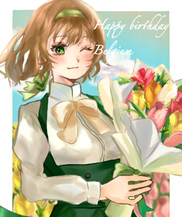 axis_powers_hetalia belgium_(hetalia) blue_sky blush bow cloud dress flower green_dress green_eyes green_headband headband holding holding_flower long_sleeves lowres one_eye_closed short_hair sky tulip upper_body user_tucm4423